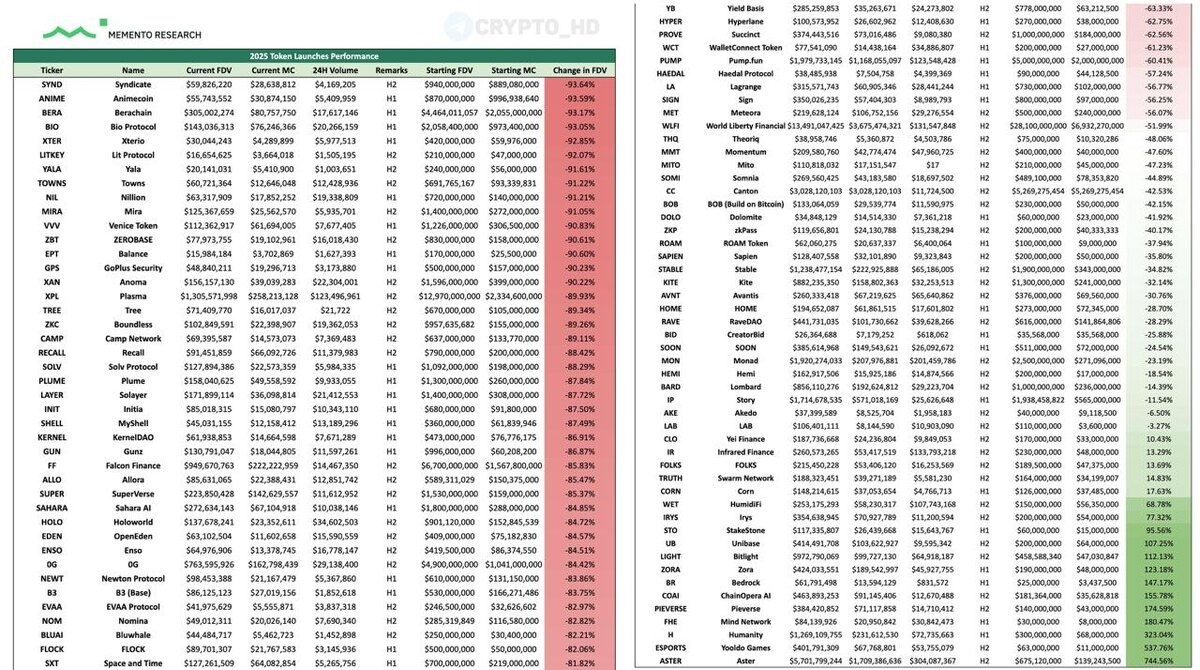 Из 118 токенов, вышедших через TGE в 2025 году, 100 (84,7%) сейчас торгуются ниже стартовых цен. Основные причины, которые выделяет рынок: ▪ Отсутствие реальной полезности у токена. ▪ Завышенные оценки на старте. Crypto Headlines