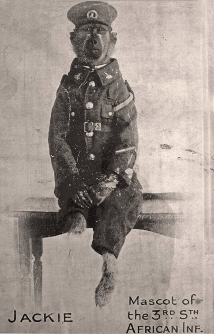 В 1910 году житель Претории Альберт Марр подобрал детеныша чакмы (вид павианов) и назвал его Джеки. Животное оказалось удивительно сообразительным, Альберт смог выдрессировать его, что было странным, ведь такие павианы в природе ведут себя очень агрессивно. Когда Альберта призвали в 3-й Трансваальский полк 1-й Южноафриканской пехотной бригады, он не смог расстаться со своим питомцем и, получив разрешение командования, взял Джеки с собой. Для него сшили полную униформу со знаками различия и фуражку. Джеки научился отдавать честь офицерам, маршировать в строю и даже есть с людьми в за одним столом. Он стал талисманом подразделения и поднимал боевой дух солдат. Была от него и практическая польза: в карауле он мог гораздо раньше людей услышать и увидеть посторонних. В 1916 году во время артиллерийского обстрела в Ливии Альберта ранило. Когда его нашли, павиан был рядом и пытался зализать его рану. Потом Альберт и Джеки были передислоцированы в Европу, участвовали в битве при Сомме. В 1918