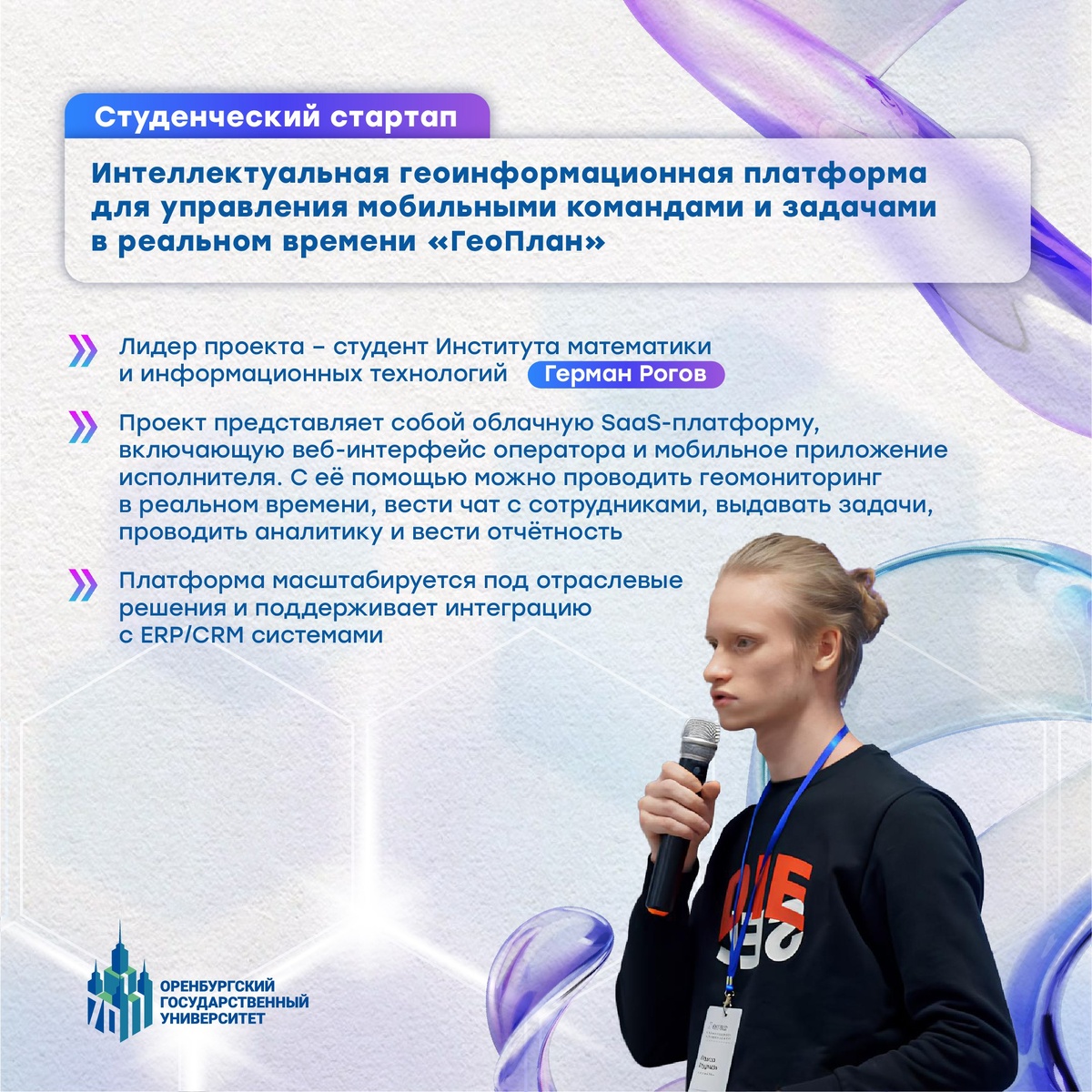 📲 Мы продолжаем рассказывать о самых интересных стартап-проектах четвертого сезон акселератора «Думай! Действуй! Воплощай!» ОГУ в нашей рубрике #МойСтуденческийСтартап. Ещё один из таких проектов – универсальная система для работы с логистикой и аналитикой в одном интерфейсе «ГеоПлан» от команды обучающихся в Институте математики и информационных технологий под лидерством Германа Рогова. Продукт создается на основе собственных научно-технических решений в области геоинформационных технологий, машинного обучения и микросервисной архитектуры. Подробнее о его функционале расписали в карточке ✍ 💬 «Наш проект объединяет все ключевые инструменты управления мобильными командами – мониторинг, задачи, чат, SOS-сигналы и аналитику, нейросетевое прогнозирование – в едином интерфейсе. Система адаптирована к российскому законодательству и инфраструктуре, работает на отечественных серверах и поддерживает кастомизацию под отрасль клиента», – подчеркнул Герман. Тоже хочешь погрузиться в мир техн