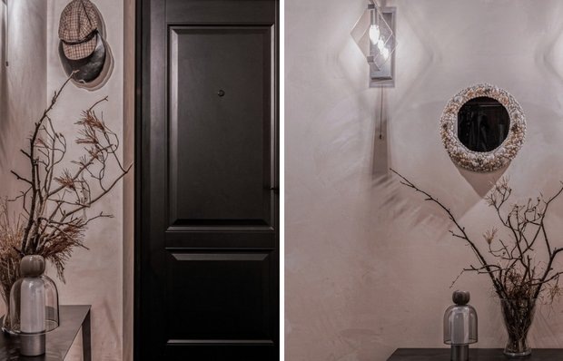 Здесь и полутона, и рельеф, и красивый свет В сталинке в Могилеве дизайнер Анастасия Придачина создала интерьер, где на первый план выходят фактуры, спокойные цвета и продуманные детали. Каждая зона квартиры с характером, но очень интересно организовано именно пространство прихожей: оно компактное и запоминающееся. Прихожая задает настроение и сразу вводит в будуарную эстетику всей квартиры. Чтобы узкая прихожая не казалась темным коридором, дизайнер сделала акцент на потолке: он окрашен в глубокий зеленый, а стены покрыты декоративной штукатуркой с бархатистой фактурой. Прием визуально вытягивает пространство вверх и придает объем. Светильники с призмой создают интересные световые акценты, подчеркивая игру света и тени, а зеркало в декоративной раме добавляет глубины и работает не только функционально, но и как арт-объект. Вместо громоздкой мебели здесь стоит узкая консоль и компактный пуф. Композиция не перегружает пространство, оставаясь удобной для повседневного использования. Да