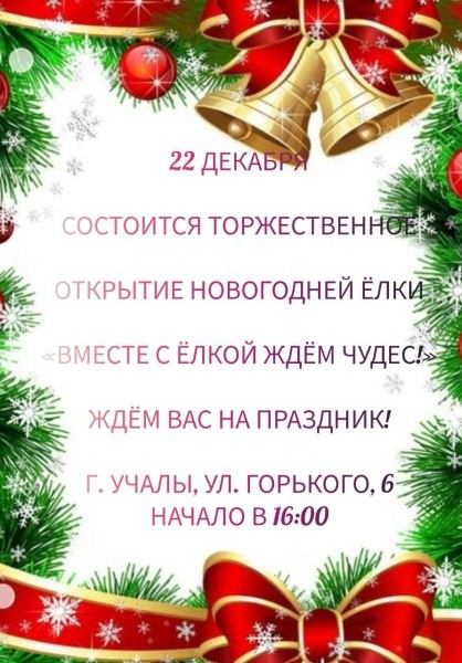 Мы рады пригласить всех от мало до велика на волшебное мероприятие — ТОРЖЕСТВЕННОЕ ОТКРЫТИЕ НАШЕЙ НАРЯДНОЙ НОВОГОДНЕЙ ЁЛКИ! ДАТА/МЕСТО ПРОВЕДЕНИЯ: — 22 декабря 2025 г. в 16:00 ч — г.Учалы ул.Горького 6; — 23 декабря 2025 г. в 16:00 — Мкр. Бурансы (белая юрта); — 23 декабря 2025 г. в 18:00 — Мкр. Южный. Вас ждёт сказочная атмосфера праздника: Волшебники устроят яркие шоу- программы и фееричные конкурсы; Весёлая музыкальная программа и зажигательные хороводы вокруг пушистой красавицы- ёлки; Сладкие подарки. Приходите всей семьей, зовите друзей и соседей — ведь Новый Год начинается именно с нас! Пусть наш праздник будет ярким, радостным и незабываемым! До встречи, друзья! Источник https://uchaly102.ru/?p=117160
