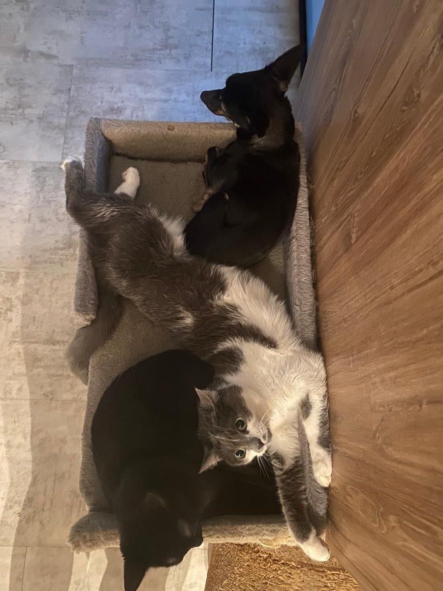Это мы — команда усато-хвостатого счастья: Тиша (кот-стратег с опытом побегов), его верная Мотя (мадам, которая держит марку) и Лаки (собака-ураган в образе пушистого добряка). Мы на фото не просто так лежим — мы демонстрируем высшую форму домашней гармонии!