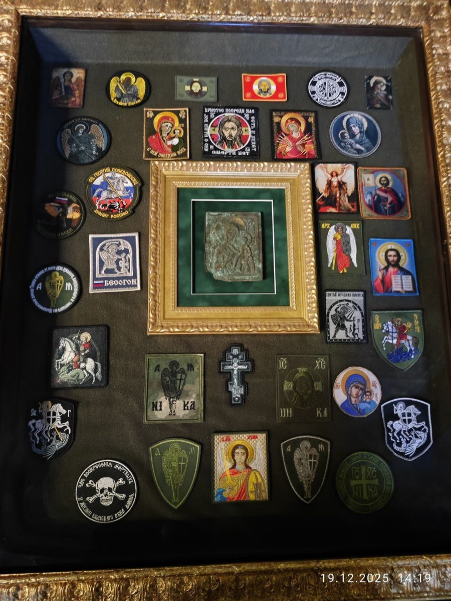 Образ Казанской Божией Матери времён ВОВ, окружённый религиозными шевронами участников СВО. Образ, исполненный в таком необычном, но трогательном виде, передали собору поисковики. В годы войны иконка, скорее всего, находилась с бойцами, получила повреждение от пули или осколка. Да, действительно, не бывает атеистов в окопе под огнём.