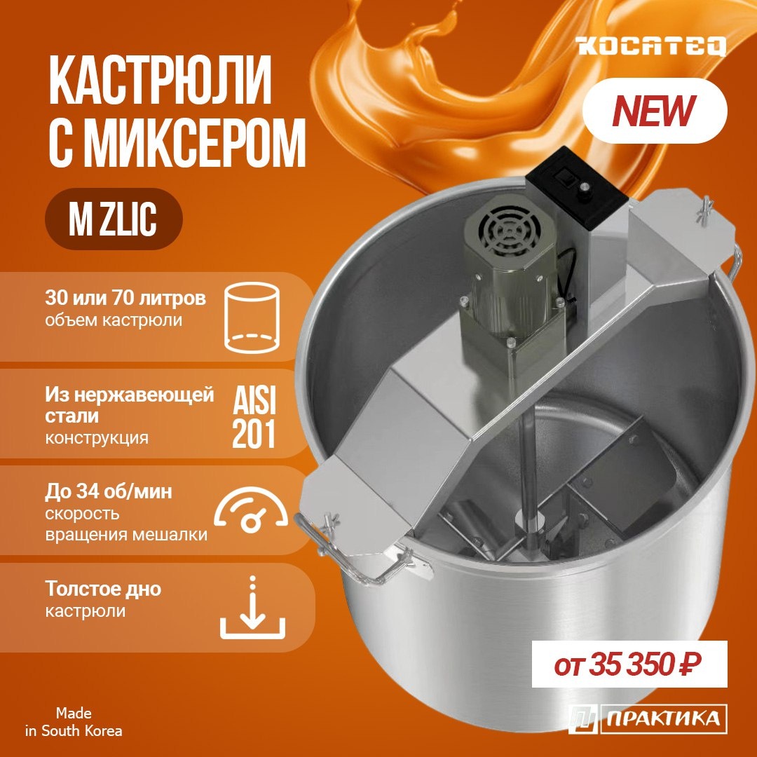 Вы часто спрашиваете о новых кастрюлях KOCATEQ ZLIC M со встроенной функцией автоматического перемешивания. Сегодня расскажем об их преимуществах и о том, где они могут найти своё применение: Такие кастрюли с перемешивающим устройством (варочные котлы со съёмной мешалкой) используются там, где важно равномерно готовить большие объёмы продукта без пригорания и постоянного ручного контроля. ГДЕ МОГУТ БЫТЬ ПОЛЕЗНЫ? Пищевая переработка и производство 🟧варка джемов, варенья, конфитюров 🟧приготовление соусов, кетчупов, майонезов 🟧мёд, патока Кондитерские производства 🟧кремы, начинки, глазури 🟧сиропы, карамель Молочные производства, в том числе фермерские и ремесленные 🟧сыроварение 🟧переработка молока Кухня общепита 🟧каши, супы, пюре 🟧приготовление фирменных соусов О ПРЕИМУЩЕСТВАХ: 1️⃣ Равномерный нагрев без пригорания. Мешалка постоянно перемешивает продукт 🟧исключает пригорание 🟧не образуется комков 🟧одинаковая температура по всему объёму 2️⃣ Экономия времени и труда 🟧
