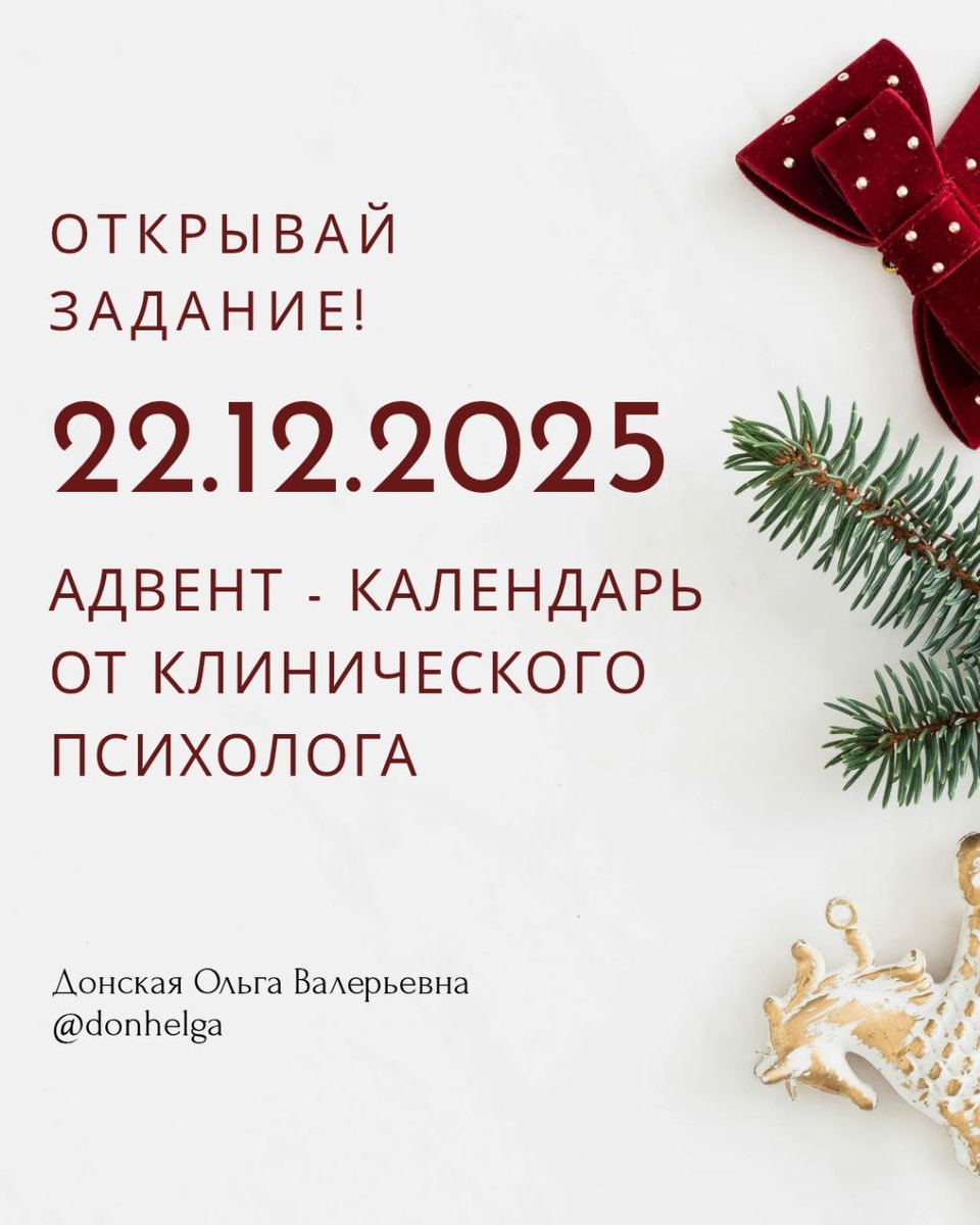: ✔️Благодарность предмету: Поблагодарите один предмет, который верно служил вам этот год (например, подушку или чашку) ✔️Письмо себе в прошлое (на год назад): Что бы вы сказали себе из декабря 2024? 2-3 коротких, добрых предложения. ✔️«Чемодан в новый год»: Мысленно соберите чемодан. ● Что вы забираете с собой из 2025? (Опыт, силу, умение? ) ● Что оставляете? (Обиду, старую роль, неактуальную цель? ) #клиническийпсихолог #психологставрополь #психологонлайн #психотерапевтонлайн #нейропсихолог #детскийпсихолог #семейныйпсихолог