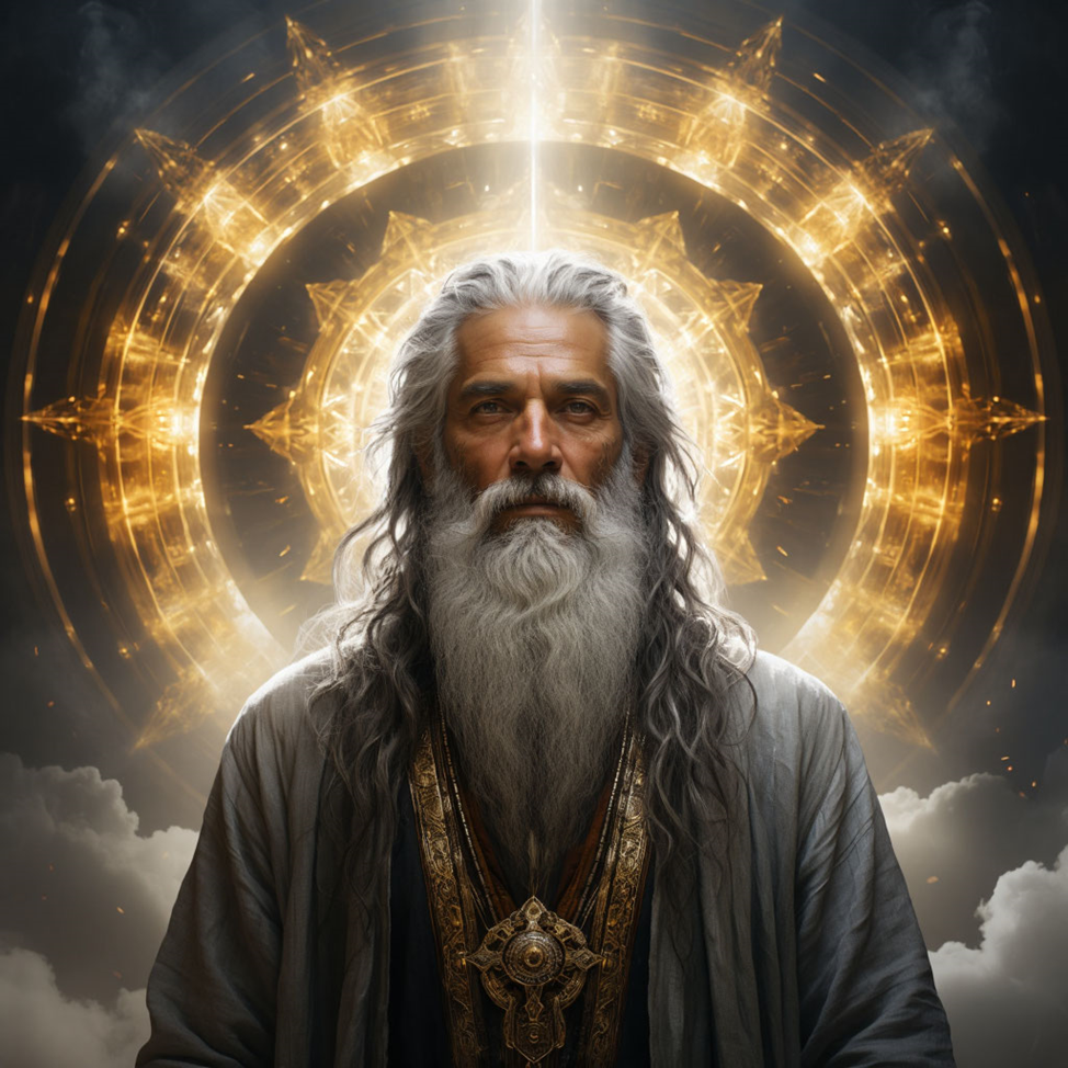 Фигура медленно обрела чёткие очертания — это был старец с безмятежным лицом, окутанный мерцающим сиянием. Его глаза, казалось, хранили тысячелетнюю память, а движения были наполнены незримой силой.