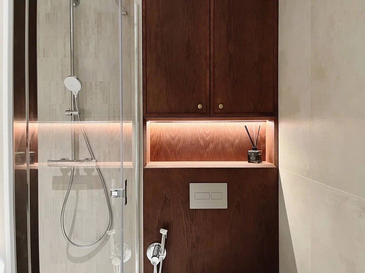 ☝️Выбран именно этот материал поскольку ванная комната — это помещение с повышенной влажностью, которая разрушительно воздействует на деревянные элементы. Должны быть использованы влагоустойчивые сорта древесины, обработанные средствами для защиты от воды.