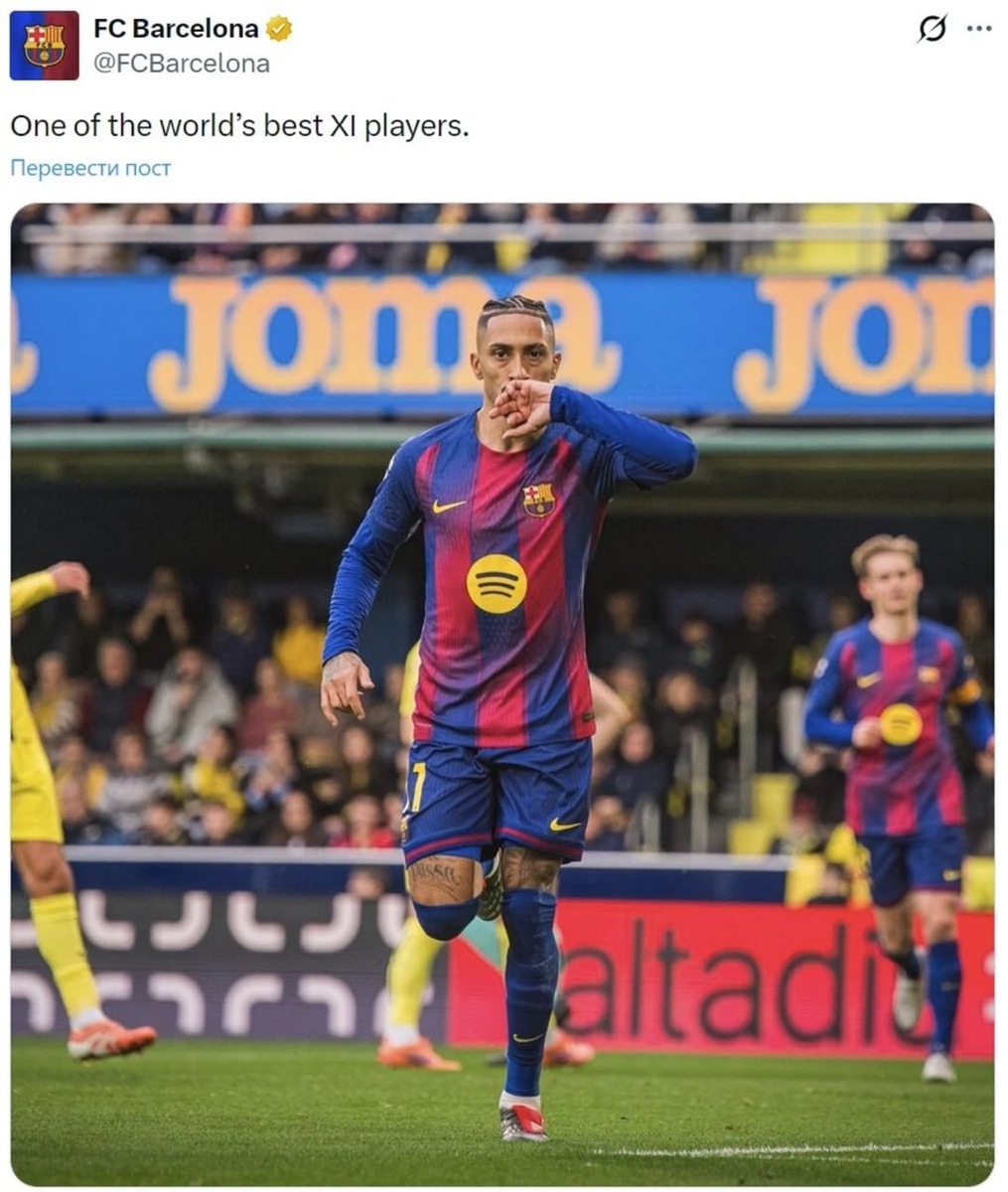 » Каталонский клуб опубликовал в соцсетях фото бразильского вингера Рафиньи, признанного MVP матча с «Вильярреалом» (2:0), с провокационной подписью: «Один из 11 лучших игроков мира». Это явный намёк на то, что футболист не был включён в символическую сборную года по версии ФИФА. Рафинья забил в той встрече с пенальти и в целом провёл отличный матч, но этого не хватило, чтобы попасть в престижный список лучших по версии международной федерации. «Барселона» таким образом публично поддержала своего лидера, подчеркнув его высокий статус в мировом футболе. ⚽️ Подписывайтесь на нас в MAX