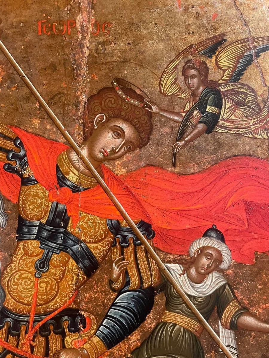 Св. Георгий. XVII в. Городской музей Ливорно Вмч. Георгий олицетворяет победу веры над темными силами. Ангел венчает святого победителем и вручает ему пальмовую ветвь — знак его мученичества, а Георгий совершает два чуда: «О змии», самое известное из своих чудес, и «Об избавлении отрока из плена». На о-ве Лесбос на храм вмч. Георгия в престольный праздник напали арабы и увезли на о-в Крит множество пленников. Среди них — юноша, чьи родители очень тяжело переживали разлуку с сыном. Через год, в день памяти Георгия, они устроили обед в честь святого. Мать горячо молилась о возвращении сына. В тот момент, когда ее муж молился, а гости разливали вино, сын хозяев появился в доме с сосудом вина в руках. Юноша рассказал, что долгое время был рабом в доме критского эмира и сегодня прислуживал ему за обедом, разливая вино. Внезапно перед ним предстал св. Георгий, посадил его на коня и перенес в родной дом. Одной рукой юноша держал святого за пояс, а в другой так и остался сосуд с вином из дом