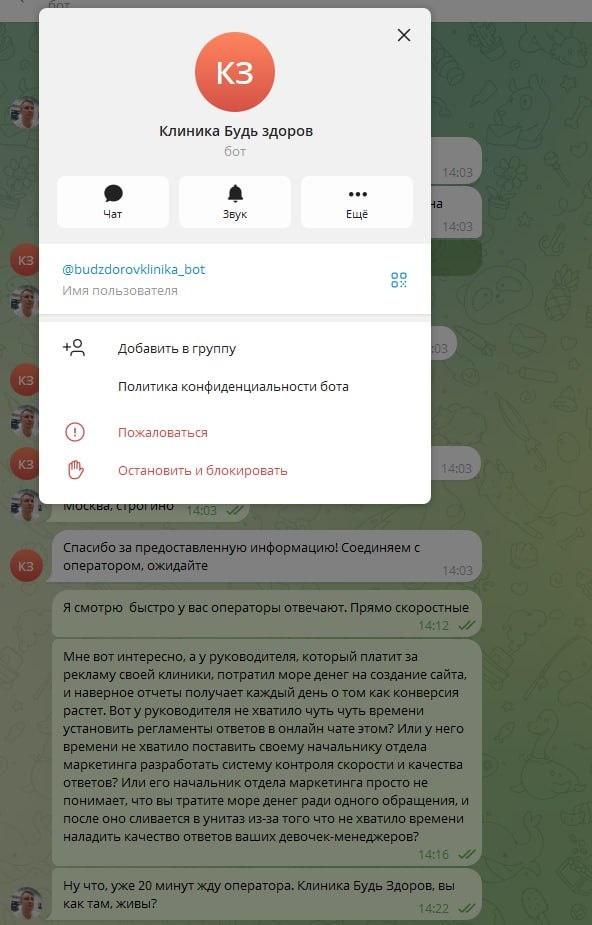 Когда ты пишешь в телеграмм конкретному человеку, то ты хотя бы видишь прочитал он или нет, во-вторых есть с кого спросить. А вот эта ботоферма - это всегда формат "никто ни за что не отвечает". Причем ладно бы, если руководство обеспечило скоростную реакцию оператора, так нет, воткнули бот на сайт и решили, что все само заработает. Коллеги - НЕ ЗАРАБОТАЕТ само. Мы как то ввели услугу "за 5000 рублей в месяц обеспечиваем тестирование скорости и качества ответов менеджеров при обращении с сайта". Вот буквально писали, звонили во все менессенджеры с сайта клиента. После замеряли скорость ответов, качество ответов и готовили отчет. Думали спрос будет. Не а.. Никакого спроса. Руководители не хотят заморачиваться контролем своих менеджеров. Так и умерла услуга. А ведь делали ее в рамках услуги "Реклама" А вот это переписка с клиникой "Будь Здоров". Казалось бы медицинская клиника, не маленькая. Должен быть свой маркетолог Но нет. Такая же ситуация