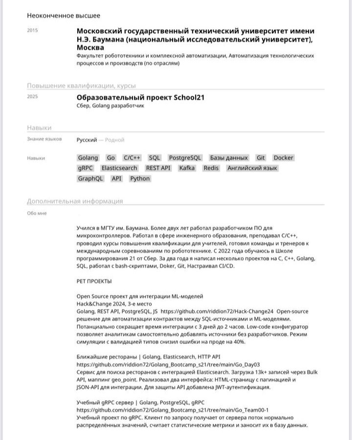 Меня зовут Екатерина Рычкова, я CEO HR-агентства и рекрутёр с 15-летним опытом. Сегодня разбираю резюме кандидата из IT-индустрии с хорошим опытом, сильной технической базой и понятной целью: переход в Go-разработку. Самое приятное, что в IT-сфере оформление резюме — не самое ключевое. Главное, на что смотрит рекрутер: Первое, что бросается в глаза, это длительный и стабильный опыт работы с embedded-системами C/C++ уровня. При этом запрос на позицию Go-разработчика. Хотелось бы больше связанности между этими этапами. Нам нужно сделать акцент: “Почему вы сильны именно для Go-разработки”. Здесь появляются первые внутренние вопросы у рекрутера: Почему именно Go? Почему этот кандидат сильный именно для этой роли? Ответ в резюме есть, но он не выделяется. А рекрутер, к сожалению, не будет додумывать за кандидата. В целом стиль описания опыта в резюме хороший. Но его можно усилить. Я всегда рекомендую использовать метод STAR: Если вы пишете в навыках Go/GoLink, он должен фигурировать и в опи