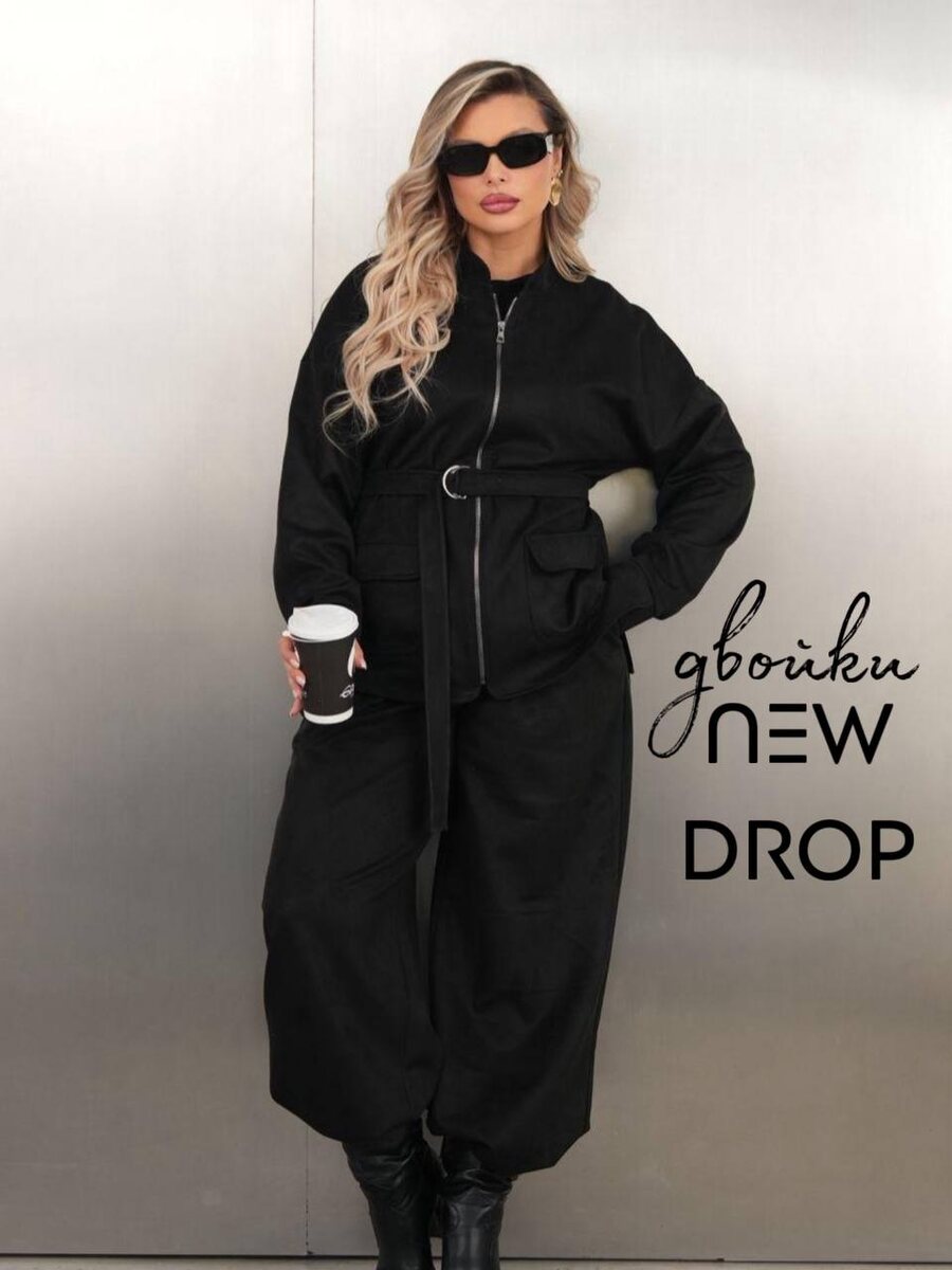 Новинки массмаркета Костюмы-двойки из спандекс-замши🔝 Ремешок в комплекте ✔️Цвета: чёрный🖤шоколад🤎 ✔️Размеры: 50,52,54,56 ✔️Длина жакета - 68 см. ✔️Длина брюк - 110 см. •Цена: 5 500 р.