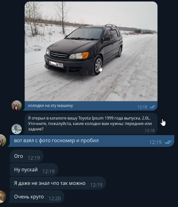 ?..." Да с помощью ReenCarBot можно: ✅ распознать фото - определить госномер на фото или VIN c фото документа ✅ Открыть машину в каталоге по госномеру и подобрать на нее запчасти Клиент просто присылает фото машины или документа где указаны данные машины - и этого достаточно для подбора запчастей. #ИИ #ReenCar #ReenCarBot #Автозапчасти #Автобизнес