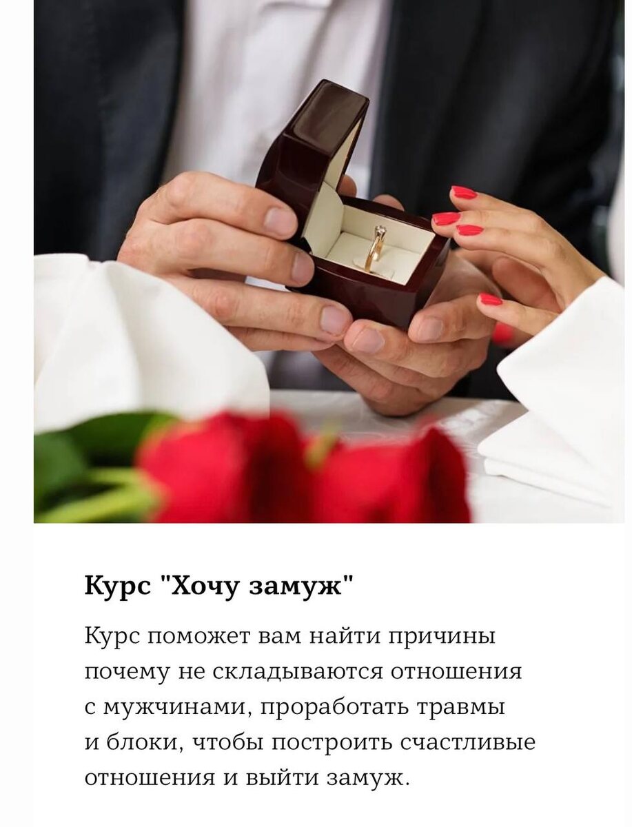 ей курс по теме отношений ,, Хочу замуж ‘’ . 💚💚У меня 2 милые женщины пройдя этот курс уже встретили своих мужчин и находятся в отношениях . 💚Курс помогает осознать свои желания , взять и на линии времени нарисовать замужество и встречу своего мужчины. 💚Курс в записи : https://treningi.valentina-medvedeva.ru/vmedvedeva_sale
