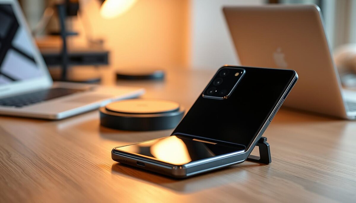 A sleek and modern Samsung Galaxy S23 smartphone, prominently displayed in the foreground on a polished wooden desk, showcasing its vibrant display and elegant design. The device is angled slightly to reveal its thin profile and premium materials. In the middle ground, a subtle blur of a workplace environment with a laptop and notebooks enhances the tech-savvy atmosphere. The background features soft, diffused lighting from a nearby window, creating a calm and professional mood. The scene conveys a sense of productivity and efficiency, highlighting the Galaxy S23’s performance capabilities, with a focus on its powerful processor and smooth multitasking features, while avoiding any human figures or overlays.