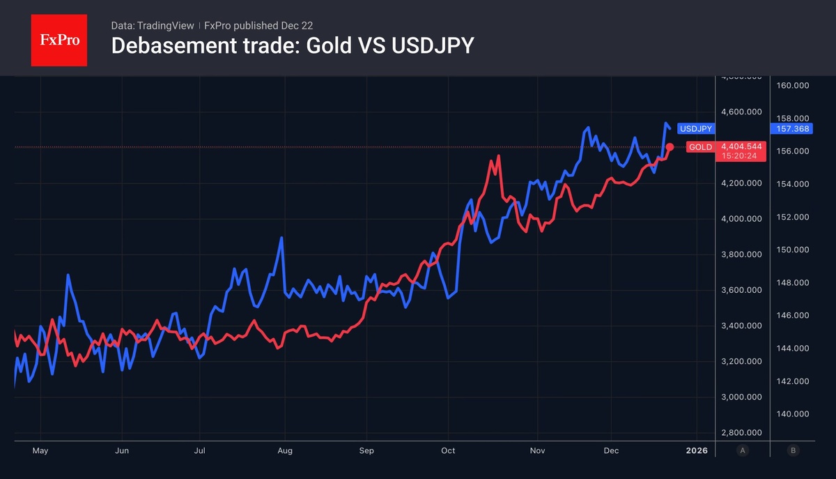 22.12.2025 Рынки ждут Рождества, центробанки – данных. Банк Японии, как и ожидалось, повысил ставку овернайт до 0.75%, максимума за три десятка лет. Однако иена резко ослабла против основных мировых валют благодаря реализации принципа «покупай слухи, продавай факты» и нежеланию BoJ использовать ястребиную риторику. Кадзуо Уэда отметил, что есть пространство для продолжения цикла нормализации, однако дальнейшие шаги будут зависеть от данных. Срочный рынок выдаёт лишь 20%-ю вероятность снижения ставки ФРС в январе и 54%-й шанс такого шага в марте. Скорее всего, ЦБ США будет ждать до весны с дальнейшим смягчением политики. Дифференциал ставок с Банком Японии остаётся широким, сохраняя веский аргумент в пользу активизации carry trade с дальнейшим ростом USDJPY. То же самое справедливо и по отношению к другим низкодоходным валютам. Доллар США в силу всё ещё высоких процентных ставок превращается в рискованный актив. Он может вырасти на фоне традиционного Рождественского ралли американских