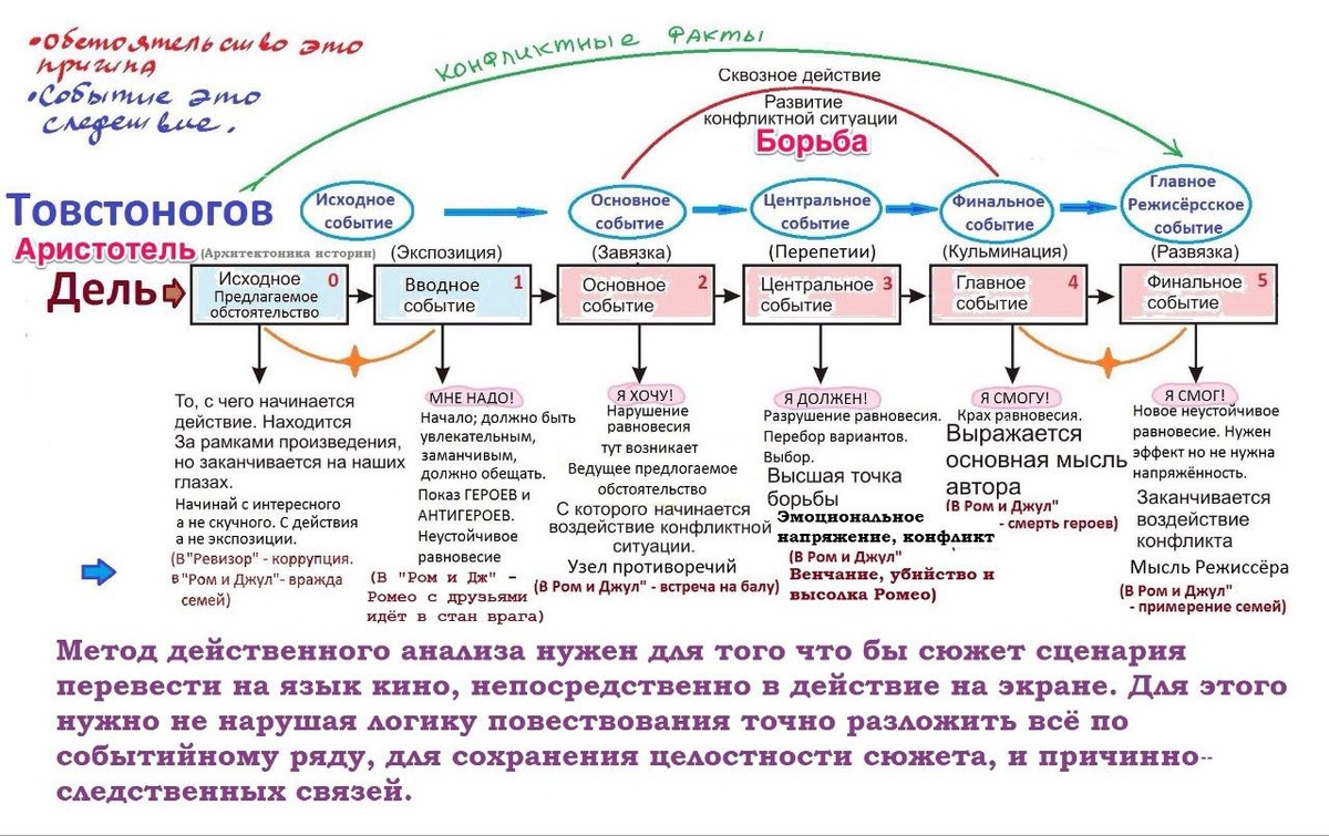 Станиславский предлагал выявить в анализе наиболее важные события, которые определяют процесс движения спектакля. Товстоногов считал, что пьеса в своем развитии опирается на пять таких событий: 1. Исходное событие — своеобразный эмоциональный «зачин» спектакля, начинается за пределами спектакля и заканчивается на глазах у зрителя. Фокусирует, отражает в себе (как капля воды — океан) исходное предлагаемое обстоятельство, зарождаясь в его недрах. 2. Основное событие — начало борьбы по сквозному действию, вступает в силу ведущее предлагаемое обстоятельство пьесы. 3. Центральное событие — высший пик борьбы в спектакле по сквозному действию. 4. Финальное событие — окончание борьбы по сквозному действию, исчерпывается ведущее предлагаемое обстоятельство. 5. Главное событие — самое конечное событие спектакля, заключающее «зерно» сверхзадачи; в нём как бы «просветляется» идея произведения. Здесь решается судьба исходного предлагаемого обстоятельства — мы узнаём, что стало с ним, изменилос