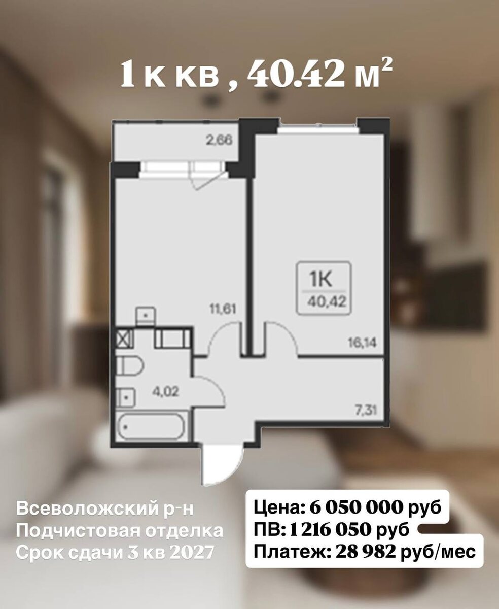 📍Всеволожский р-н Ⓜ️ Ладожская 15 мин транспортом Расчет по ипотеке: • цена — 6 050 000 ₽ • ПВ 20.1% — 1 216 050 ₽ • платеж — 28 982 ₽/мес. О ЖК: На территории ЖК спроектированы школа и детские сады, современные детские и спортивные площадки, места для отдыха и пешеходный бульвар. Авторский ландшафтный дизайн предполагает высадку деревьев и кустарников различных видов. Внутренние дворы закрыты от машин. Для владельцев автомобилей на территории квартала будут построены многоуровневые парковки. На первых этажах жилого квартала разместились коммерческие помещения. Проект возводится в развитом, тихом районе со всей социальной и коммерческой инфраструктурой. До исторического центра города можно доехать за 25 минут на автомобиле. В пешей доступности продуктовые магазины, школы, детские сады, медицинские центры, фитнес-центр с бассейном, кафе, зоомагазины, остановки общественного транспорта. Проект окружают лесные массивы. В шаговой доступности находится Ржевский лесопарк, так же рядом ра