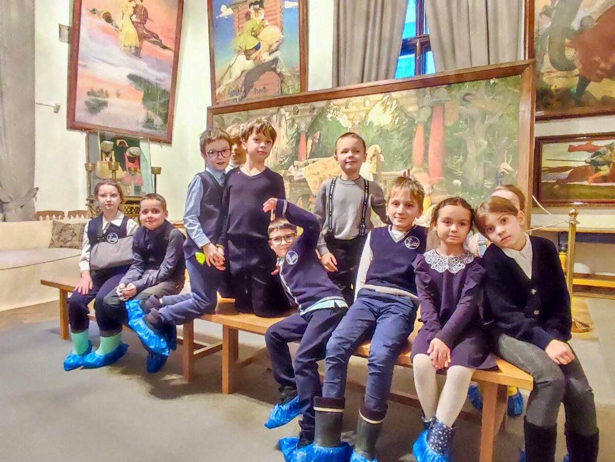 🖌 💫 Ученики 2-го «А» класса вместе со своим классным руководителем Лидией Михайловной Аверкеевой побывали в доме-музее В. М. Васнецова. Здание, расположенное в самом центре Москвы, одновременно напоминает современную крестьянскую избу и древний княжеский терем, срубленный из дерева по проекту самого художника. 🎨 На экскурсии ребятам рассказали о великом художнике. Выросший в деревне, художник впитал в себя русские обычаи, песни и сказки. Деревенский люд ассоциировался им с носителем народной мудрости, поэзии и искусства. Это и определило направление его творчества в будущем. 🧚 В мастерской ребята увидели цикл картин художника «Поэма семи сказок»: «Баба-Яга», «Сивка-Бурка», «Ковер-самолет», «Спящая царевна», «Царевна-Лягушка», «Царевна Несмеяна» и «Кощей Бессмертный». Васнецов был одним из первых, кто оживил на своих полотнах волшебный мир сказок, былин и русского фольклора. 🪑 Почти вся деревянная мебель в доме выполнена по рисункам художника, а многие экспонаты сделал брат Вас