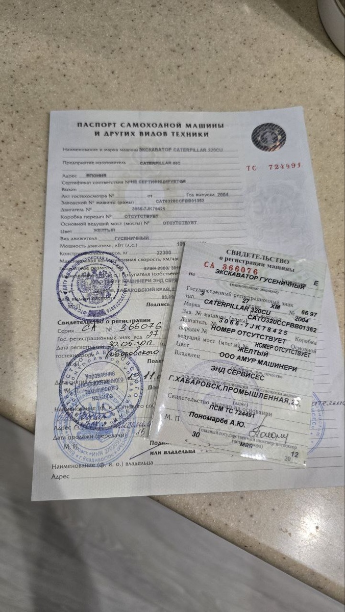 Документы на Экскаватор Caterpillar 320 2004 г.в. ПСМ и свидетельство Цена 50 000