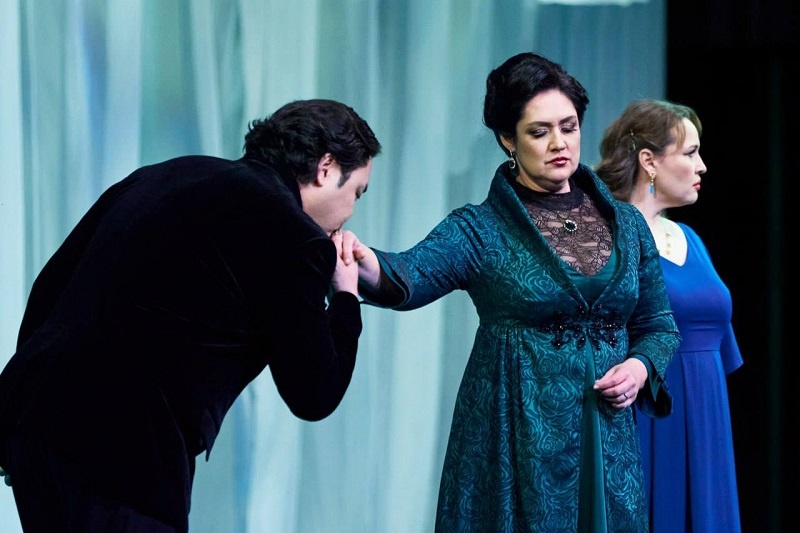 Даже все небольшие партии (Илья Селиванов – Чекалинский, Кирилл Попов – Распорядитель, Евгения Сегенюк – Гувернантка, Полина Пелецкая – Прилепа и др.) были спеты-сыграны очень выразительно и качественно, голоса звучали ярко и убедительно, дикция отличалась четкостью – в титрах не было абсолютно никакой надобности. Центральные же исполнители радовали свободой вокализации и настоящей stage presence, магнетическими голосами – масштабными и красивыми, соответствующими задачам русской grand operá. К особенностям и тонкостям интерпретации всегда можно придираться – так, Иван Гынгазов (Герман) пережимает с экзальтацией своего героя и злоупотребляет оглушающим звуковым напором, Елена Стихина (Лиза) – частенько холодновата в выражении эмоций, ее героиня слишком аристократка, Константин Шушаков (Елецкий) – слишком увлекся изображением незначительности своего персонажа, что выражалось и в сценическом поведении, и в чуть мелковатом звучании – но делать этого решительно не хочется, поскольку какие-то «минусы» с лихвой искупались огромными «плюсами». А ряд солистов убедил стопроцентно – свежо, буквально чарующе звучащая Полина Шароварова (Полина), поражающий богатством звуковой палитры Ариунбаатар Ганбаатар (Томский), и, конечно же, по праву царившая Агунда Кулаева (Графиня), прожившая свою знаковую партию-роль тонко и глубоко одновременно, даже несмотря на то, что как раз в образе, предложенном режиссером ей, ощущались экстравагантные нотки интерпретации, с которой певица уже имела дело однажды – в достопамятной «Пиковой» Юрия Александрова в прошлом десятилетии на сцене родной для нее «Новой оперы», где игривая и моложавая аристократка удивляла порой весьма сильно.