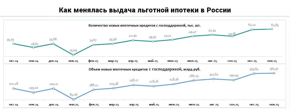 ⚡️ Объем выдачи льготной ипотеки в России за 11 месяцев 2025 года сократился на 10% — до 2.79 трлн рублей