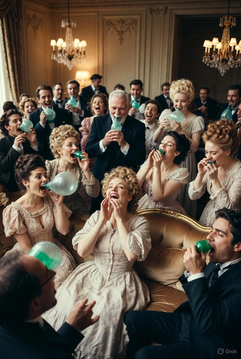 😆💨 Друзья, представляете: в конце XVIII — начале XIX века наука была не только серьёзной, но и... настоящей вечеринкой! 😂🎉🧪 А началось всё с Хамфри Дэви — молодого химика-гения, который в 1799 году открыл этот газ и решил: «А давайте-ка я его попробую сам!» 🌟😵💫 Он дышал им в лаборатории, хохотал до слёз, видел яркие цвета и чувствовал себя супергероем. Потом подумал: «Это же идеальное развлечение!» 🎭✨ И понеслось: по всей Англии и Америке устраивали 'laughing gas parties'! Светская знать собиралась в салонах, вдыхала газ из мешков, падала от смеха, пела песни и обнималась. Дамы в кринолинах визжали от счастья, джентльмены декламировали стихи upside down! 👒🤪🥂 Публика была в полном восторге: «Это лучше шампанского!» А учёные серьёзно думали, что газ лечит всё — от депрессии до зубной боли. 🦷😄 В итоге Дэви стал знаменитостью, а газ стали использовать для анестезии в стоматологии.