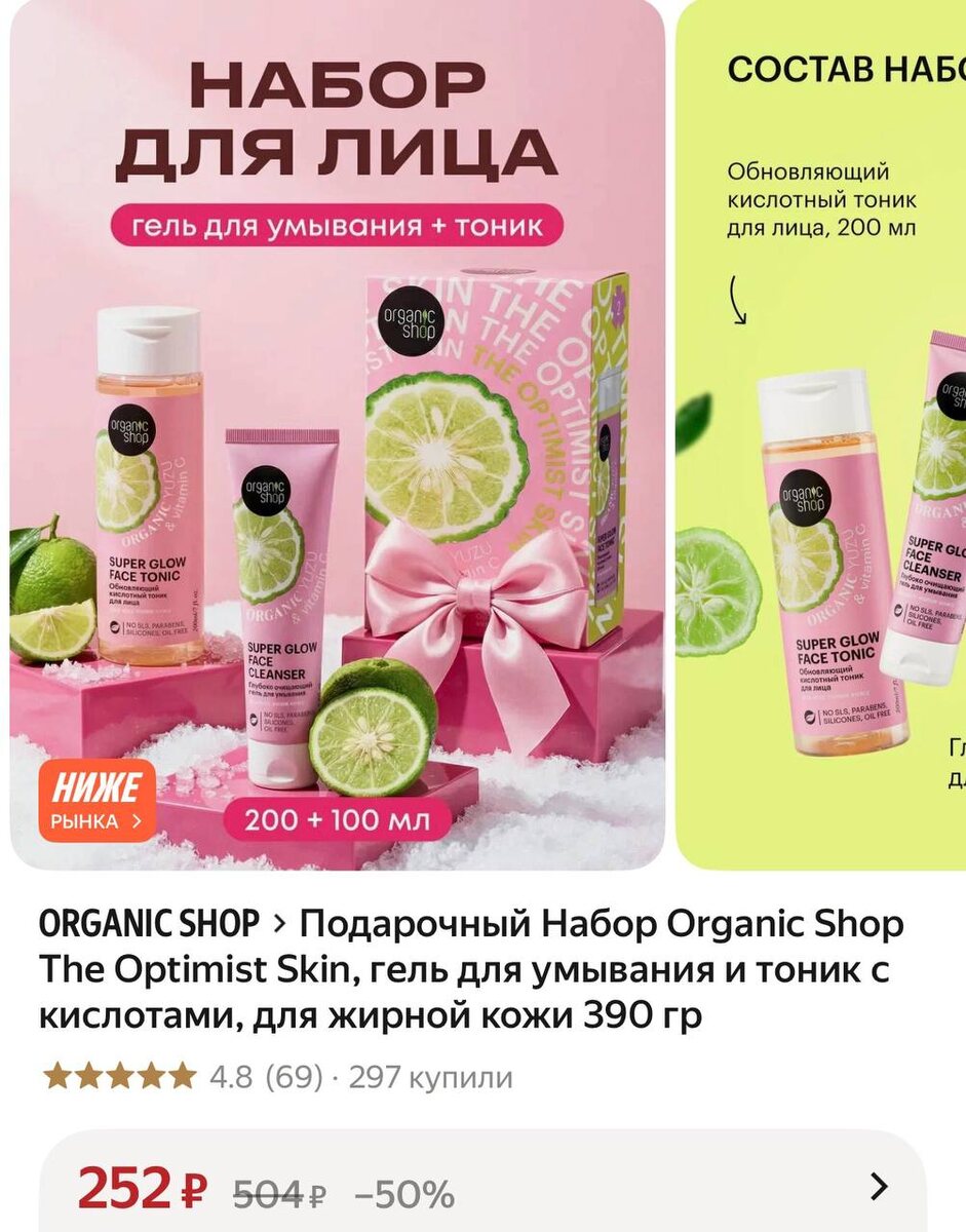 Подарочный Набор Organic Shop The Optimist Skin, гель для умывания и тоник с кислотами, для жирной кожи 390 гр