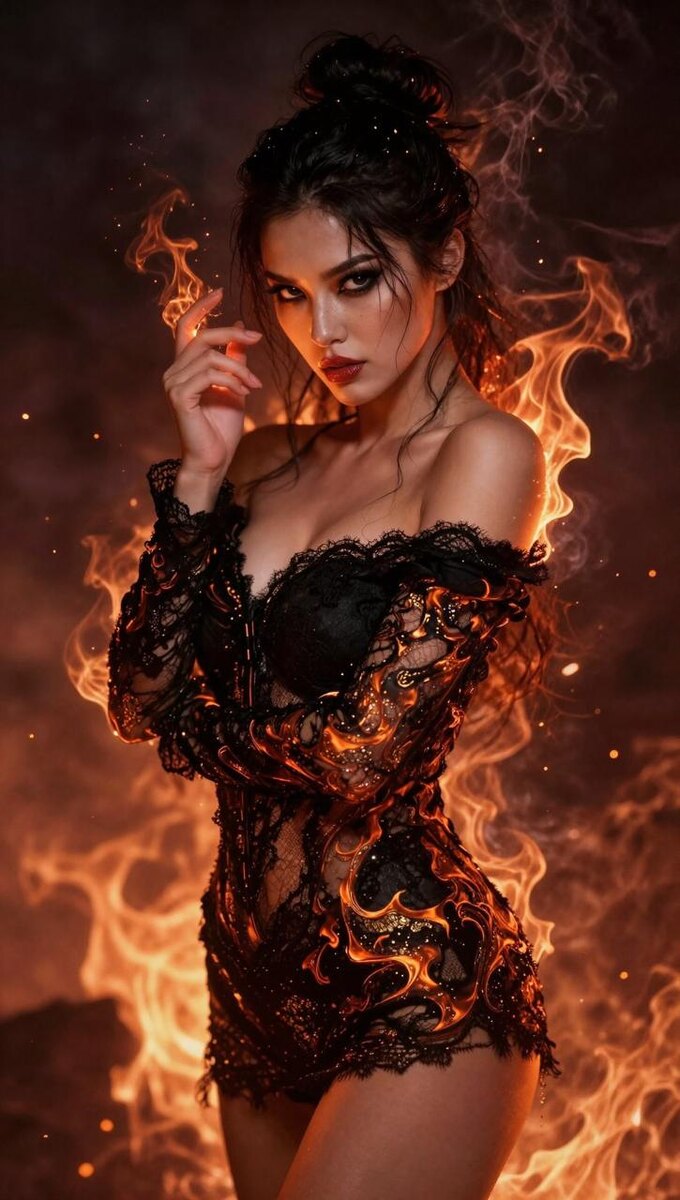 ! 🔥 Разберём, как создать гиперреалистичный портрет в стиле фэнтези с огненной стихией. 📝 Оптимизированный промт: medium shot of a woman with dark voluminous hair in a high messy bun, wisps of fiery smoke and glowing embers escaping from hair and shoulders. She gazes directly at viewer, dark smoky makeup, lips slightly parted with red lipstick, hand near face, fingers delicately curled, glowing embers catching in nails. Wears off‑the‑shoulder black lace top and matching shorts with intricate fiery orange and gold patterns that appear to be burning. Scene bathed in dramatic cinematic lighting — intense orange and red hues from swirling flames illuminating skin, hair, clothing, casting deep shadows. Background: dark smoky void, floating embers, glowing sparks, wisps of smoke. Hyper‑detailed, photorealistic style, volumetric lighting, focus on texture (lace fabric, smoke, embers), 8K resolution, cinematic composition, fantasy portrait 💡 Что изменили и почему: 🔘 Следовали правильному