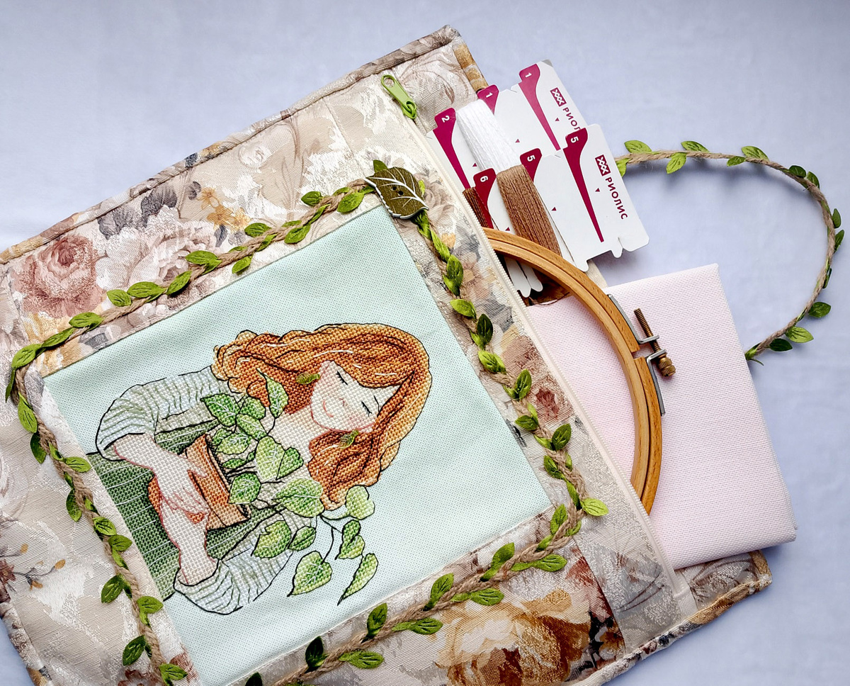 В качестве ткани-компаньона к «Цветочнице» из-за фона напрашивается нечто зелёное, но варианты из моих запасов слишком тёмные или уходят в синеву, поэтому я взяла ткань, оставшуюся после пошива штор. В ней есть блестящие элементы, совсем как в волосах цветочницы, а ещё лучше соединяет ткань и вышивку та самая бечёвка с листьями.