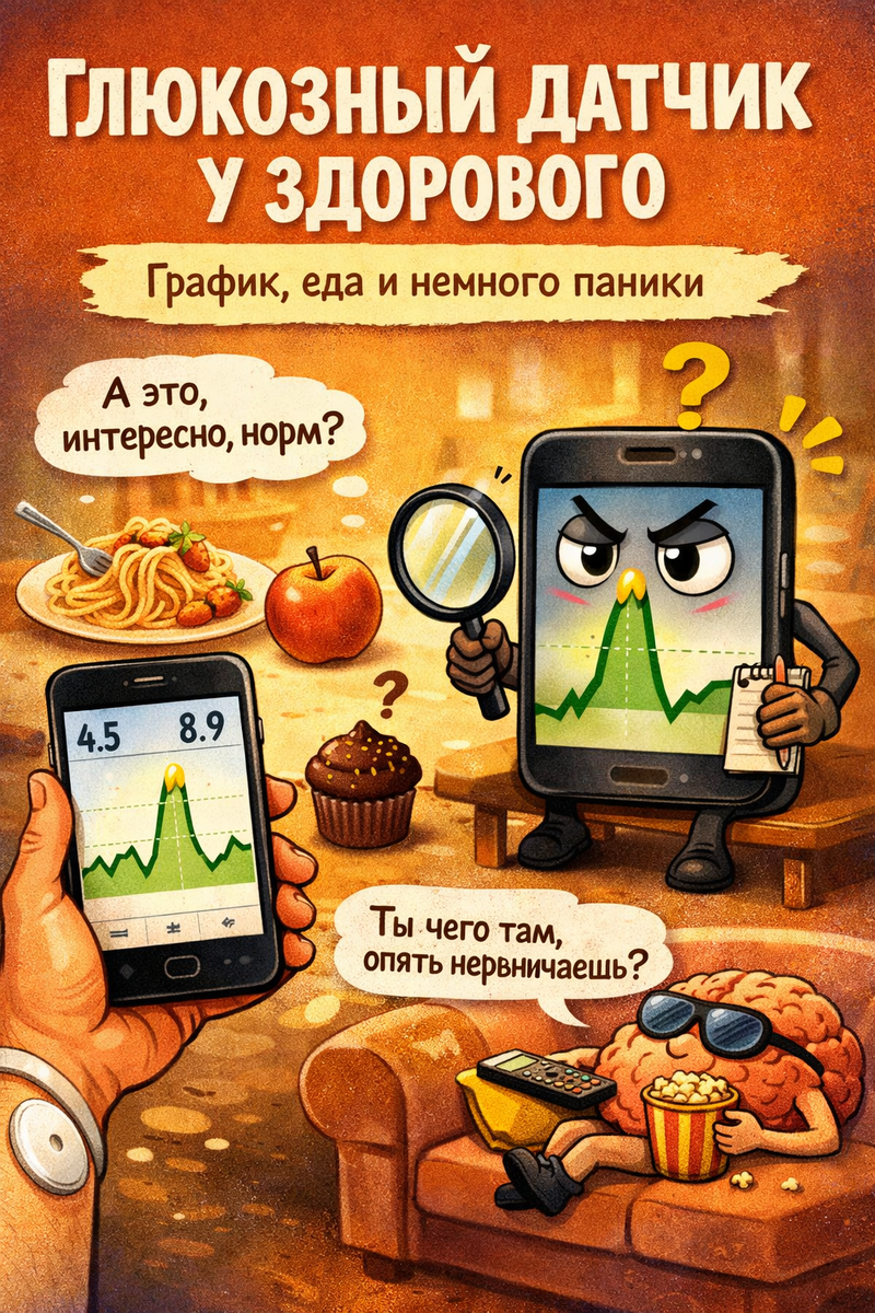 Есть вещи, которые меняют жизнь не потому, что они жизненно важные, а потому что они слишком наглядные. Например, датчик глюкозы. До него ты жил(а) нормально: ел(а), работал(а), иногда уставал(а), иногда хотел(а) сладкого, иногда просто хотел(а) лечь и стать пледом. А потом появляется линия. И ты внезапно понимаешь, что твой организм — это не “я поел(а) и всё”, а целый сериал. Просто теперь у сериала есть график. День 1. “О, я теперь вижу правду!” Первые ощущения обычно приятные: “вау, я вижу, что происходит”. Ты ешь — и ждёшь, как будто сейчас выйдет оценка. Линия идёт вверх. И мозг, как настоящий любитель драм, шепчет: “Ну всё. Это плохо.” Хотя линия не говорит “плохо”. Линия просто делает то, что глюкоза в живом организме умеет делать: меняться. Проблема не в том, что линия двигается.