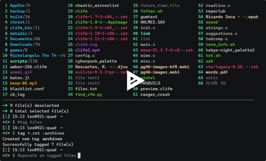 Clifm — это файловый менеджер для терминала, работающий в командной строке и обладающий интерфейсом, схожим с оболочкой shell. Он поддерживает стандартные команды оболочки, что делает его интуитивно понятным для пользователей, а также предоставляет расширенные функции, такие как автодополнение и подсказки команд. Программа работает как REPL (Read-Eval-Print Loop), позволяя использовать терминал не только для управления файлами, но и как полноценное расширение оболочки. * Уникальный CLI-интерфейс: Полное отсутствие графического (GUI) или текстового (TUI/ncurses) интерфейса. Взаимодействие происходит исключительно через командную строку. * Entry List Numbers (ELN): Каждому файлу в списке присваивается номер. Это позволяет выполнять операции (копирование, удаление, переход) по номеру, а не по длинному имени файла. * Расширенный поиск: Поддержка поиска файлов с использованием шаблонов (glob) и регулярных выражений, а также возможность рекурсивного поиска по каталогам. * Встроенный просмотр