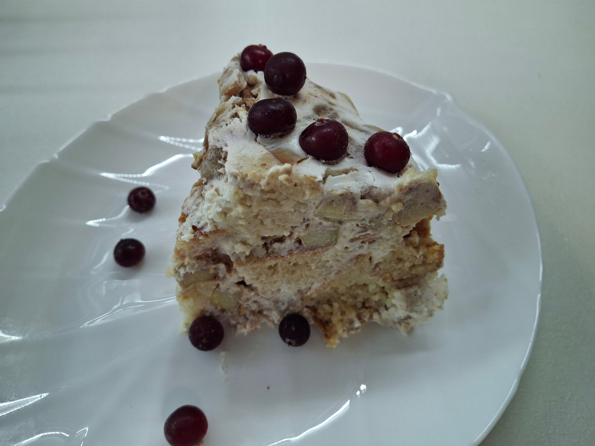 Яблоки добавляют свежесть и приятную текстуру. Состав: для бисквита: Крем: Приготовление: Яйца смешать с молоком и 1 ст.л. сахара. Добавить яблоки очищенные и натёртые на мелкой тёрке. Добавить муку, смешанную с разрыхлителем. Замесить тесто. Оставить тесто на 20 минут. Выложить тесто в форму. Если у вас не силиконовая, смажьте маслом или застелите пергаментом. Поставить в духовку, разогретую до 160 градусов, на 40 минут. Режим верх-низ, без конвекции. Готовим крем. У яблок удаляем сердцевину, режем на мелкие кубики. Разогреваем сковородку, выкладываем масло и яблоки. Добавляем сахар смешанный с корицей. Добавляем воду и тушим на медленном огне 8-10 минут. Остужаем. Творог взбиваем с 2 ст.л. сахара. Затем добавляем остывшие яблоки. Смешиваем. Остывший бисквит режем на кубики. Миску ( форму для тортика) выстилаем пищевой плёнкой. Собираем тортик. На дно выкладываем 2 ст л. крема, затем часть нарезанного бисквита. И так слоями, пока всё не закончится. Накрываем форм