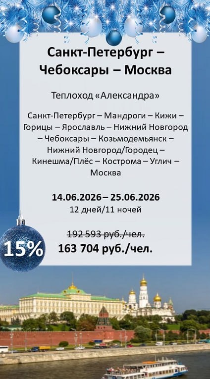 До 30.12.25 успейте забронировать круизы по рекам России на летний сезон 2026 года со скидкой до 15%! 📌 Рекомендуем круизы на теплоходах Премиум-класса: Круиз из Москвы в Санкт-Петербург на теплоходе “Генерал Лавриненков” Даты: 20.05 – 25.05.26 на 5 н./ 6 дн. Маршрут: Москва - Углич - Горицы - Кижи - Мандроги - Санкт-Петербург Стоимость: от 70 958 руб/чел Круиз из Санкт-Петербурга в Москву на теплоходе “Александра” Даты: 14.06 – 25.06.26 на 11 н./ 12 дн. (есть короткие варианты маршрута на 4 - 7 н.) Маршрут: Санкт-Петербург - Мандроги - Кижи - Горицы - Ярославль - Нижний Новгород - Чебоксары - Козьмодемьянск - Нижний Новгород - Городец - Кинешма - Плёс - Кострома - Углич - Москва Стоимость: от 163 704 руб/чел Круиз из Казани в Ростов-на-Дону на теплоходе “Генерал Лавриненков” Даты: 25.09 – 01.10.26 на 6 н./ 7 дн. Маршрут: Казань - Болгар - Самара - Саратов - Волгоград - Старочеркасская - Ростов-на-Дону Стоимость: от 71 335 руб/чел 📍 Условия акции: - действует на новые бр