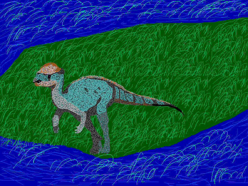 Вокруг зеленой травы. У реки. Вернее такое небольшой реки. С медленным течением. Стоит динозавр. Его зовут Acrotholus. Он небольшой по меркам динозавров. Около 2 метров в длину. Вес всего-то 40 килограмм. Очень интересно, что на голове у него такой купол. Это кость. Толщина 10 сантиметров. Этим он очень сильно удивляет. Это такой нарост, как каска. Чем-то похоже со стороны. Травоядный динозаврик. Житель леса. Вот и бродит у реки в свой солнечный денек. Ему нравится ходить – там где много травы. Такая вкусная вещь. Покушать можно. Даже в этой реке растет тоже трава. Это хорошо для Акротола. Акротол – динозавр. Пусть и небольшой по размеру. По сравнению со своими большим друзьями. Мелкие динозавры, их тоже было много. Это один из них. Вот в траве ему самое место. В Высокой траве. А какое небо сегодня. Синее небо. И трава зеленая. Все утопает в зелени. Динозавр здесь живет и знает это место очень хорошо. В очередной раз пришел на этот угол леса. Где почти сразу идет река. Река течет неспе