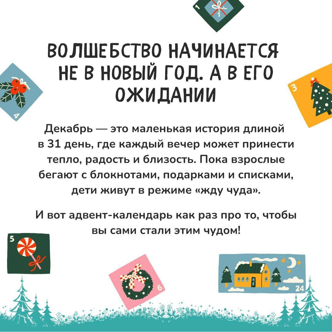 ! ✨ Настоящий адвент — это не про картинки из Pinterest. Это про то волшебство, которое начинается утром с детского вопроса: «А что у нас сегодня?» Это атмосфера ожидания, маленькие ежедневные радости и совместные семейные дела. Это чувство, что каждый день декабря — особенный. Но как создать это волшебство самим? Мы собрали для вас простые и душевные идеи адвент-календарей, которые легко сделать вместе с детьми. Попробуйте — и весь декабрь будет наполнен счастьем! 🎄