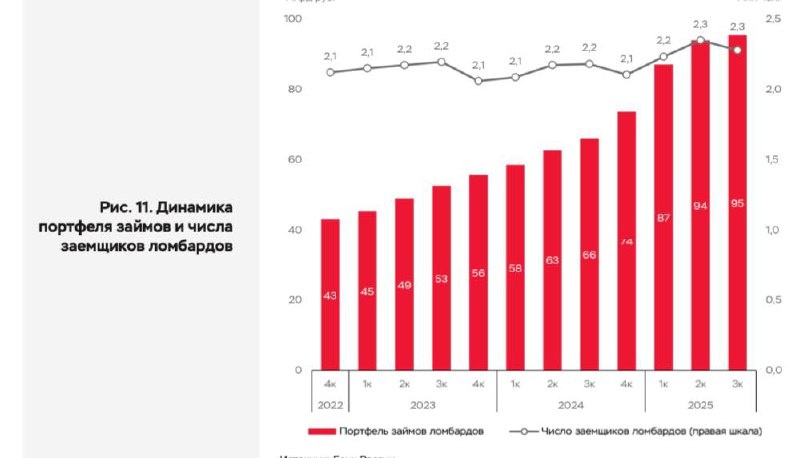 Российские ломбарды получили за январь–сентябрь 9,6 млрд руб. чистой прибыли. Это на 54% больше год к году. В третьем квартале средний размер займа увеличился до 21,3 тыс. руб. против 18,1 тыс. руб. годом ранее. Это следует из обзора ЦБ. При этом спрос на услуги ломбардов в третьем квартале начал снижаться. Число заключенных договоров займа снизилось до 4,6 млн. Это на 4% меньше квартал к кварталу и на 11% меньше год к году. Объем займов вырос на 1%. Квартальный прирост портфеля ломбардов стал минимальным с первого квартала 2023 года. В третьем квартале ломбарды получили 14 млрд руб. от продажи невостребованных вещей. Число заемщиков в июле—сентябре достигло 2,3 млн человек против 2,3 млн годом ранее. Подпишитесь на «Ювелир и закон» в Telegram | ВКонтакте | Дзен | Сетка