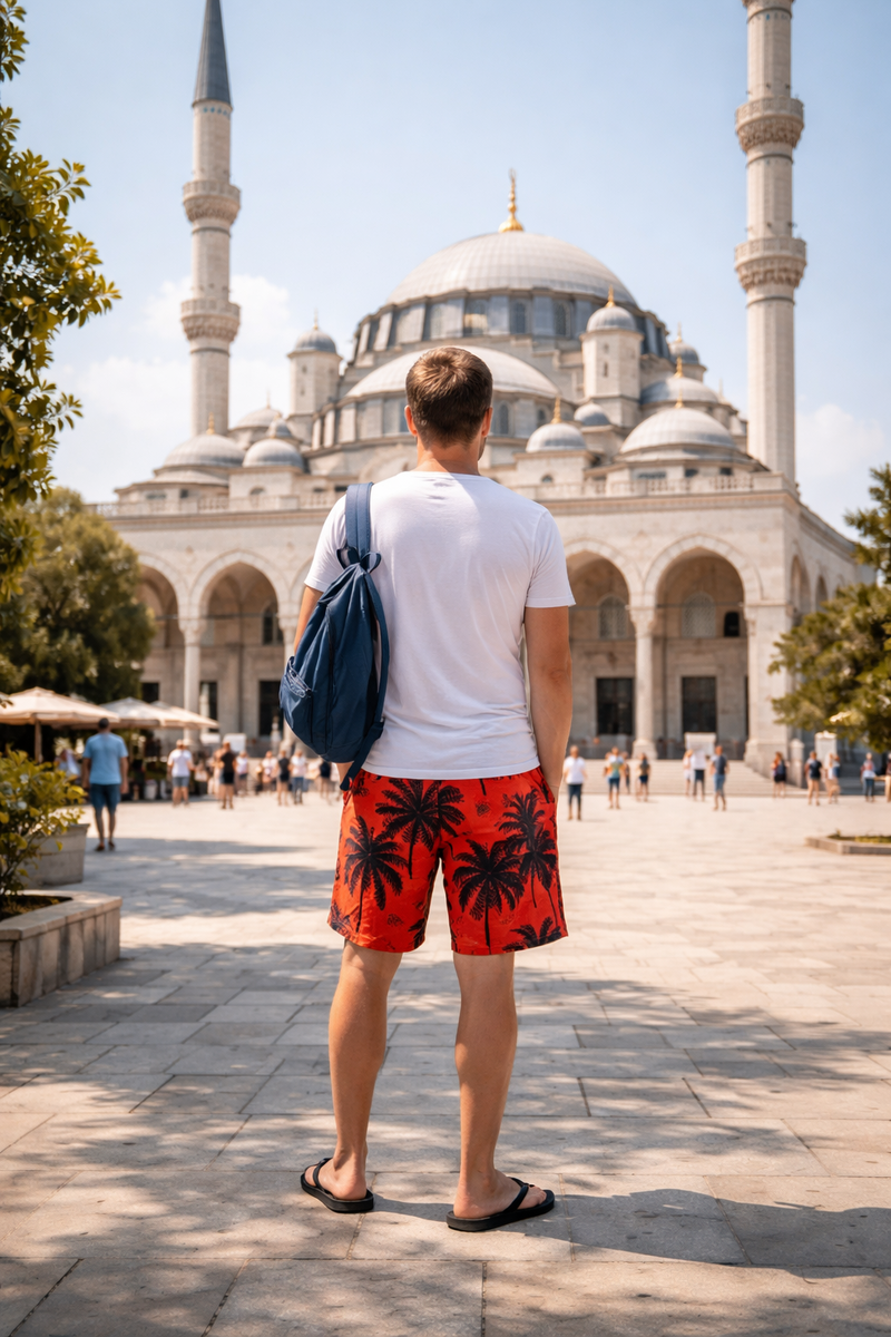Вы стоите в шортах у мечети. Солнце, отпуск, красота.