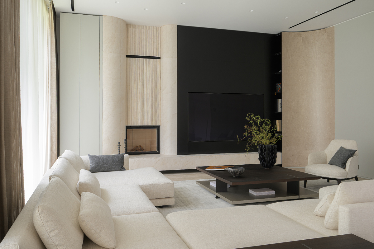Стиль этого дома - тот самый “теплый минимализм” в классическом исполнении, основой которого являются природные материалы и спокойные цветовые решения. Такой гармонии удалось достичь, в том числе, благодаря привлечению одного поставщика на все работы по натуральному камню. Речь об итальянской фабрике Salvatori. Камень в их обработке используется в отделке камина, отдельно стоящих и встроенных раковин, на мебельных фасадах в ванных комнатах и т.д. Казалось бы, зачем заказывать такой дорогостоящий мрамор прямо из Италии, да еще и с обработкой на заводе и везти сюда, когда можно было привлечь наших мастеров по камню. Но нет. Salvatori — это супер качество, уникальные запатентованные технологии обработки, дорогие современные станки, заводское качество и гарантированный результат. Но главное - это цельность, ведь используется один и тот же камень по всему дому. Да, это дороже, стоимость таких элементов - 500-800 евро за кв.м, но это точно стоит того. Во всяком случае, это точно выделяет это