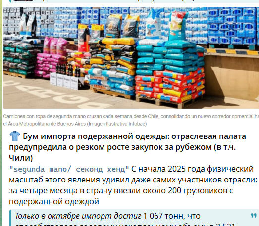 👕 Бум импорта подержанной одежды: отраслевая палата предупредила о резком росте закупок за рубежом (в т.ч. Чили) "segunda mano/ секонд хенд" С начала 2025 года физический масштаб этого явления удивил даже самих участников отрасли: за четыре месяца в страну ввезли около 200 грузовиков с подержанной одеждой Только в октябре импорт достиг 1 067 тонн, что способствовало годовому накопленному объему в 3 521 тонну, согласно данным, собранным Аргентинской промышленной палатой одежды. Это количество составляет примерно 11% от общего объема импорта одежды, прошедшего через аргентинскую таможню за этот период. Эти цифры вызвали беспокойство у представителей деловых кругов и торговцев, которые задали вопрос о влиянии таких объемов на национальную производственную цепочку