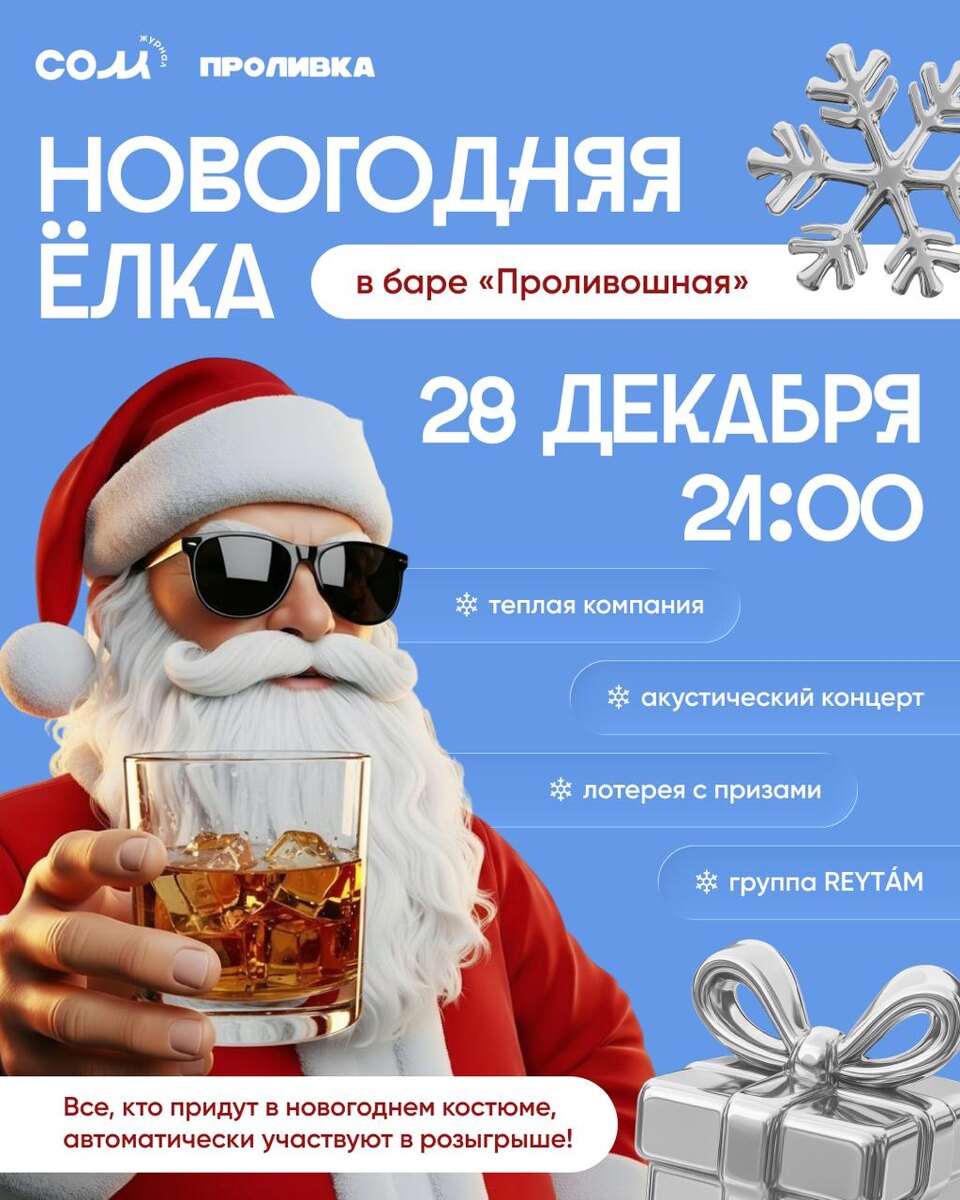 » 28 декабря приглашаем всех на новогднюю ёлку 🎉 В программе: ✨интерактивы от секретнего гостя ✨призовая лотерея среди гостей вечера ✨акустический концерт группы REYTА́M ✨ Все, кто придут в новогоднем костюме, автоматически участвуют в розыгрыше Вход свободный Сбор гостей — 21:00 Поем под гитару — 23:00 📍Куйбышева, 81 @somsomsom