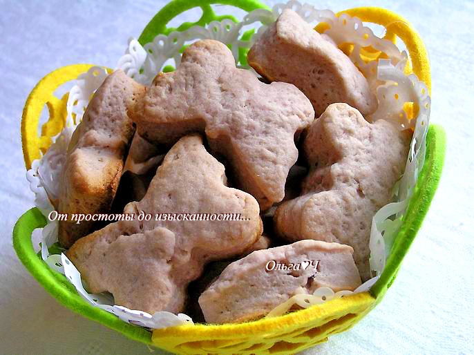 1 ч. л. разрыхлителя Приготовление: В вишневом соке растворите сахар, добавьте ванилин и масло, перемешайте. Постепенно добавьте муку с разрыхлителем и солью, перемешайте. И замесите эластичное тесто. Тесто раскатайте, толщиной 0,5-0,7 см, вырежьте любые фигурки. Переложите на противень и выпекайте при 180*С около 25 минут. Приятного аппетита! Вам также могут понравиться: