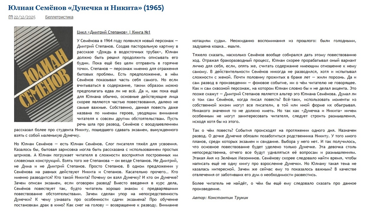 Юлиан Семёнов "Дунечка и Никита" (1965) | Критика