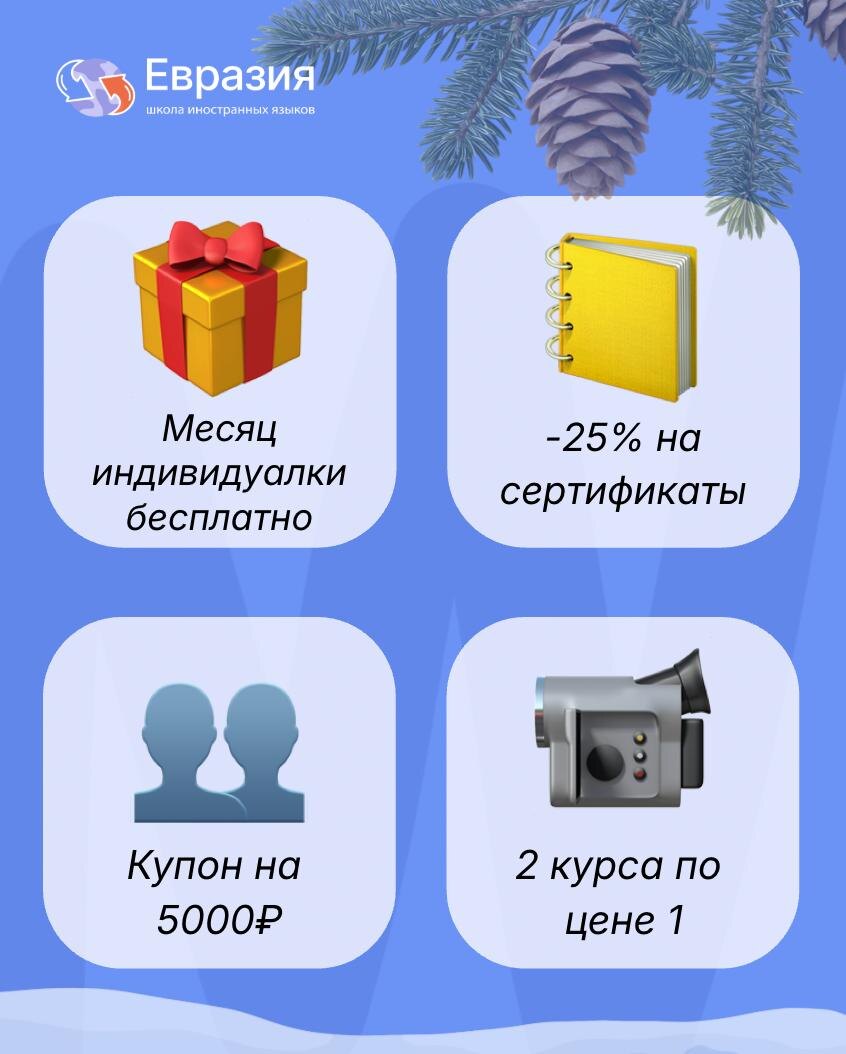 🎄 А мы напоминаем про подарки, которые реально радуют и не пылятся на полке. 💸 Подарочные сертификаты −25% Даришь на 10 000 ₽ — платишь 7 500 ₽. Подходит и как подарок, и как повод наконец начать самому. ПОДРОБНЕЕ 🎁 +1 месяц индивидуальных занятий бесплатно Покупаешь пакет — получаешь ещё 4 недели уроков без доплат. Больше практики, быстрее прогресс. ПОДРОБНЕЕ 💸 Купон 5000₽ за групповой курс Оплатил группу — получил купон. Потрать сам или подари другу. ПОДРОБНЕЕ 📹 2 курса по цене 1 Выбирай два курса или марафона — оплачиваешь один, получаешь доступ к обоим. Отличный вариант, чтобы пройти новое направление самому или подарить второй курс близкому. ПОДРОБНЕЕ Напишите ЗИМА С ЕВРАЗИЕЙ✨ в @Eurasia_online_help_bot — мы всё подскажем и зафиксируем подарки, пока они действуют.