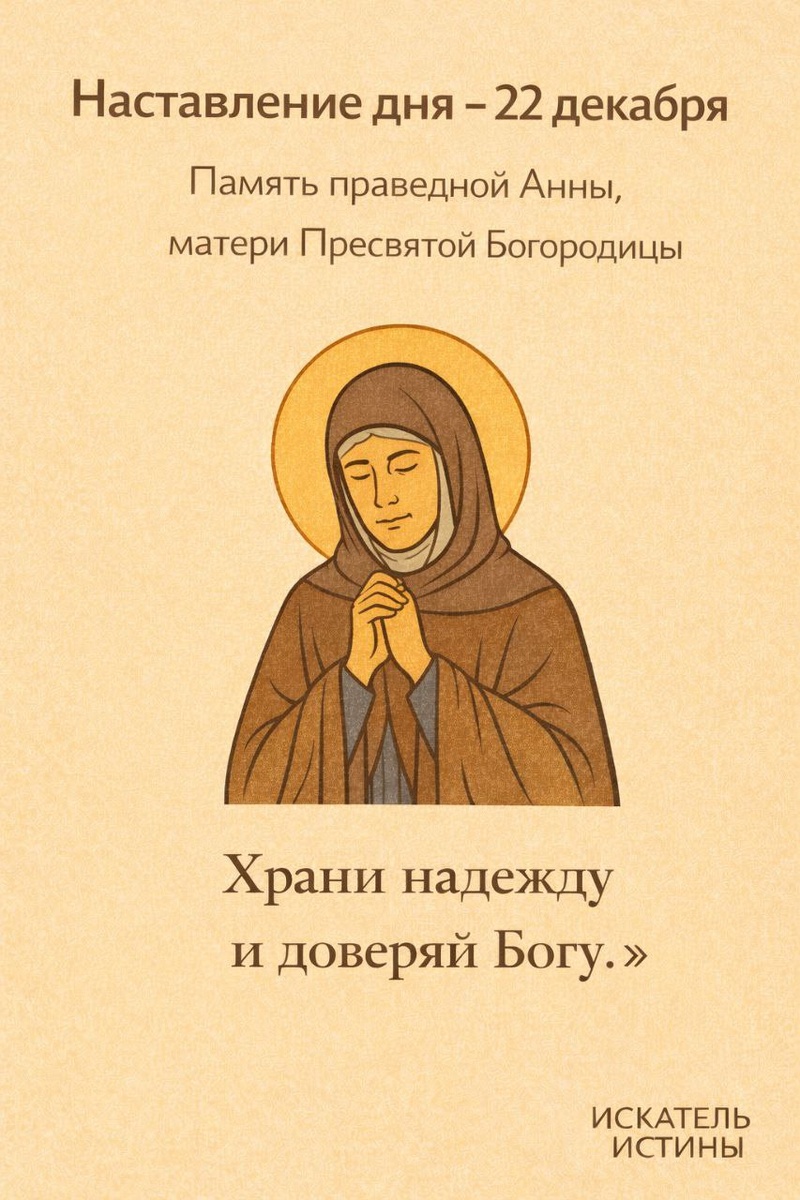 Память праведной Анны, матери Пресвятой Богородицы Праведная Анна явила пример терпения, смирения и глубокой надежды на Бога. Долгие годы она несла скорбь без ропота, сохраняя веру и молитву, и Господь ответил ей великим даром — рождением Пресвятой Богородицы. Её жизнь учит нас доверять Богу даже тогда, когда ответ кажется далёким, и помнить: смиренное сердце никогда не бывает оставлено без утешения. Пусть и твой день будет наполнен терпением, благодарностью и тихой надеждой на милость Божию.