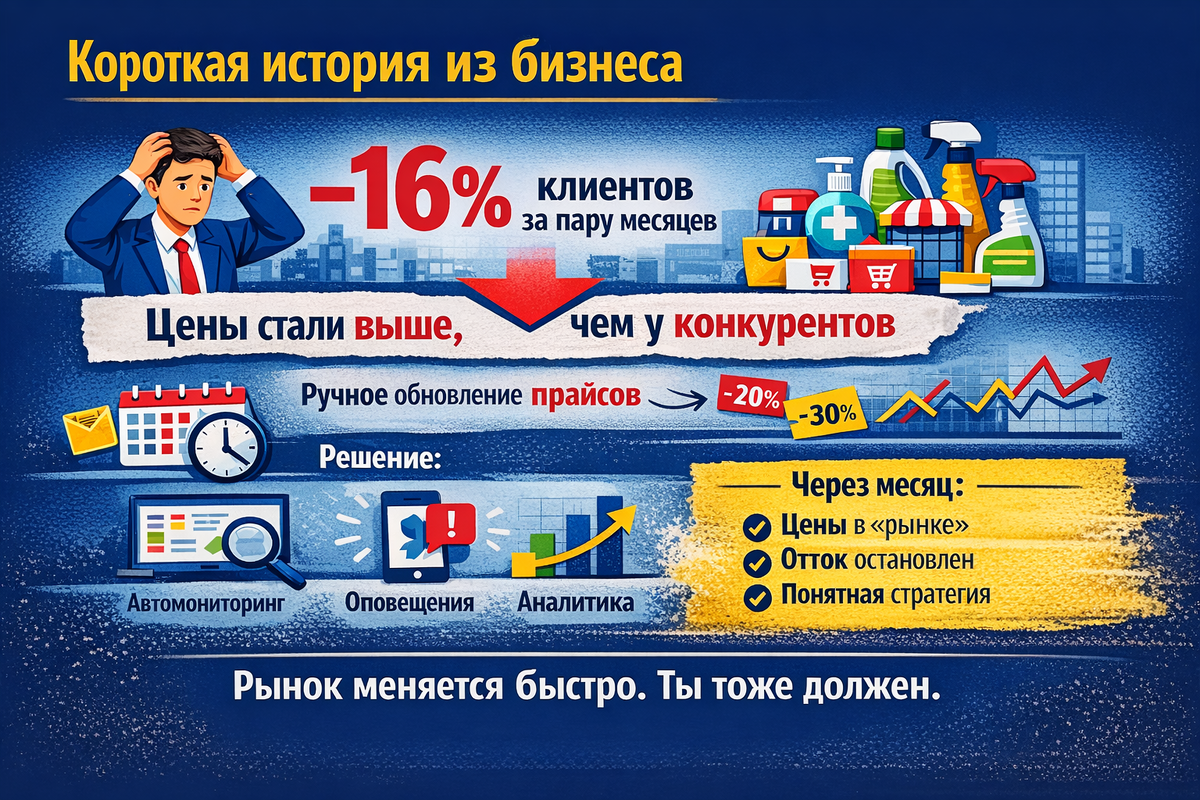 Представьте: вы годами выстраиваете бизнес, работаете с крупными торговыми сетями и маркетплейсами, продажи растут, всё идёт по плану. И вдруг — бац! — за пару месяцев теряете 16 % клиентов. Что случилось? Всё просто: ваши цены неожиданно оказались выше, чем у конкурентов. Наш герой — поставщик бытовой химии — столкнулся с этой проблемой лицом к лицу. Он: Ситуация выглядела безвыходной: сотни товаров, десятки площадок, постоянные изменения. Уследить за всем вручную — нереально. На помощь пришёл MarketParser. Вот что он изменил: В современном бизнесе нельзя: MarketParser даёт вам главное — актуальную информацию и возможность реагировать моментально. Не ждите, пока клиенты уйдут к конкурентам! Проверьте, насколько ваши цены конкурентоспособны прямо сейчас. 👉 Узнайте больше о возможностях MarketParser #бизнес #ценообразование #маркетплейсы #конкуренция #автоматизация