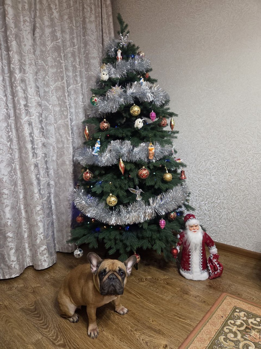 На выходных мы семьей наряжали дома елку. Моя собака Майя помогала нам в этом.