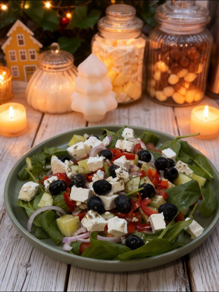 🧾Ингредиенты: ▫️1 огурец ▫️Половина красной луковицы ▫️Половина сладкого болгарского перца ▫️1 крупный помидор ▫️120 г сыра Фета ▫️Шпинат (или другая зелень) ▫️100 г маслин ▫️4 ст. ложки оливкового масла ▫️1 ч. ложка орегано ▫️1 ч. ложка базилика ▫️1 ч. ложка лимонного сока Огурец нарезать крупными кусочками. Половинку красной луковицы нарезать полукольцами. Перец нарезать соломкой. Помидор и фету нарезать тонкими кубиками. На дно салатника выложить зелень, у меня это шпинат. Далее выложить помидор, огурец, перец, лук, сыр фету и маслины. Готовим заправку. В оливковое масло добавить орегано, базилик и лимонный сок, и тщательно перемешать. Заправить салат. Вкусный а-ля греческий салат готов. Приятного аппетита! #греческийсалат #салаталягреческий #фета #рецепт #вкусныйсалат #легкийужин #рецепты #здоровоепитание #быстрыйрецепт #салатза5минут #рецептыKateVi11