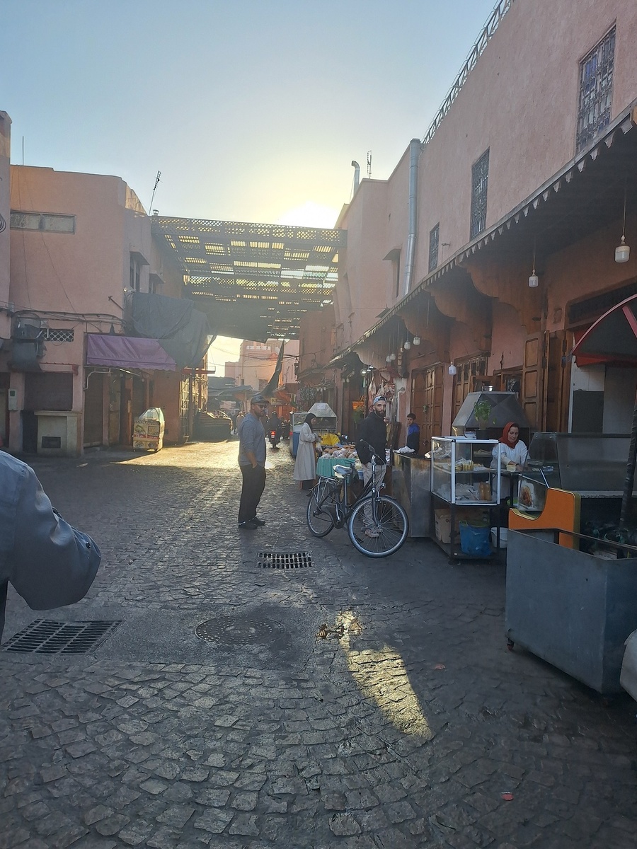 Марракеш, приезжай в Марракеш Говорит мне сердце, когда мне одиноко. Марракеш, приезжай в Марракеш, Ты найдешь частичку себя в Марракеше. Марракеш город красного золота. Марракеш город, где Ив Сен Лоран нашел свое вдохновение. Марракеш город садов. Марракеш город истории. Да да, именно это все про него. Такой вот противоречивый имперский город. После завтрака погнали по городу. Снова мы в медине. Утро. Город посыпается. Свежий хлеб. Можно прикупить мясо. Куры да так вот, выбрали, вам ее тут же рубанули, ощипали, выпотрошили. Свеженькая курочка к столу. Оливки, зелень, естественно мята. Кофе в зернах. Тут же лепешки пекут тонюсенькие. Фрукты и овощи. Доставка товара. Барбершопные тоже открываются и начинают свою работу. В школе учеба уже началась. А вот и котик работает охранником на стопке с ковриками. Мы в старок квартале, у мечети Бен Юсуфа, она на реставрации, но можем увидеть ее снаружи. заворачиваем за угол и мы в медресе Бен Юсефа (название в честь той старой мечети). Медресе и
