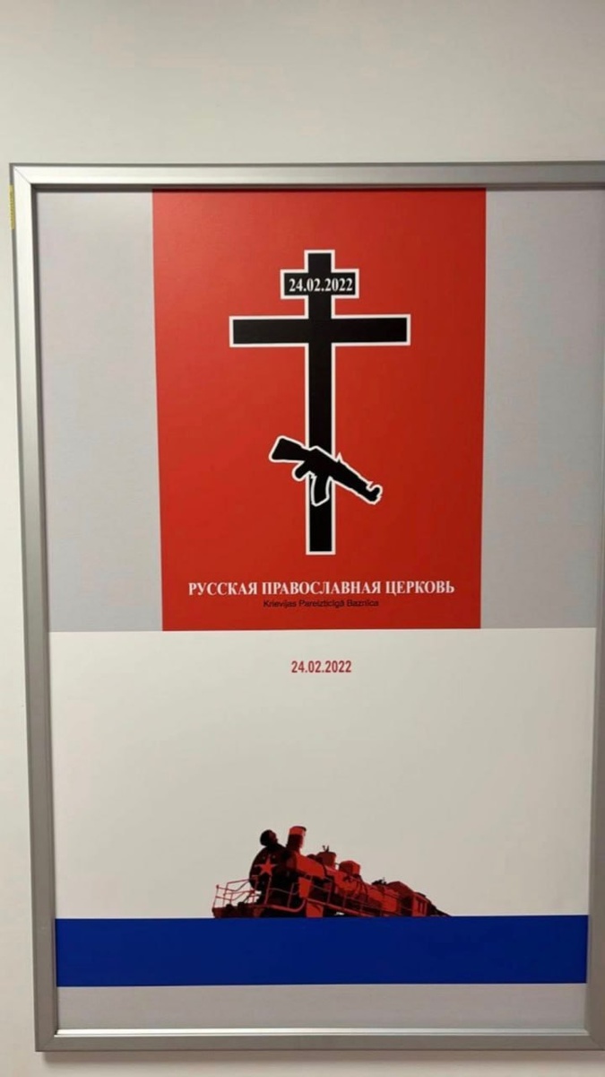 О как! В рижской школе повесили плакат против РПЦ, на котором в восьмиконечный православный крест вписан автомат Калашникова.